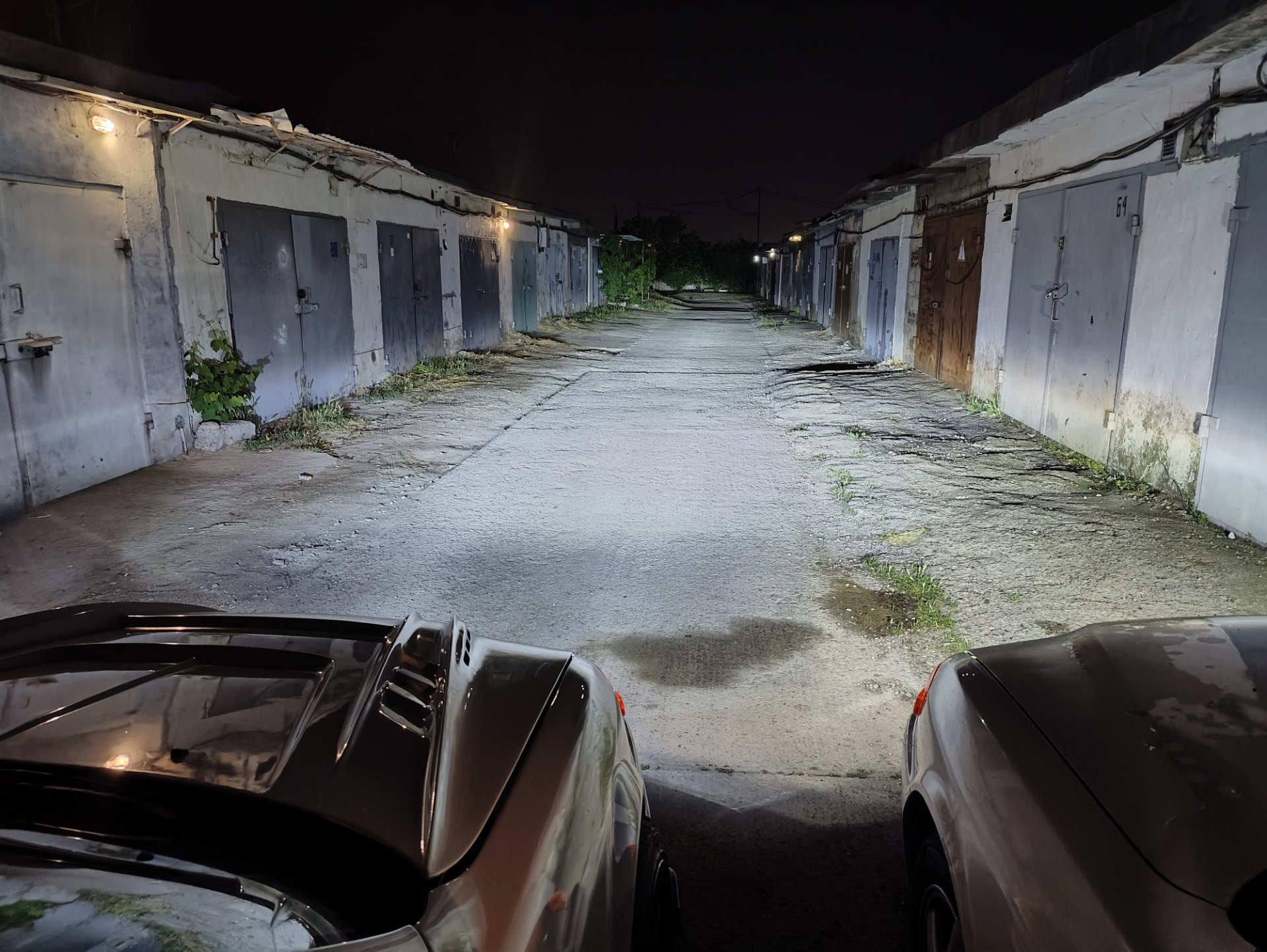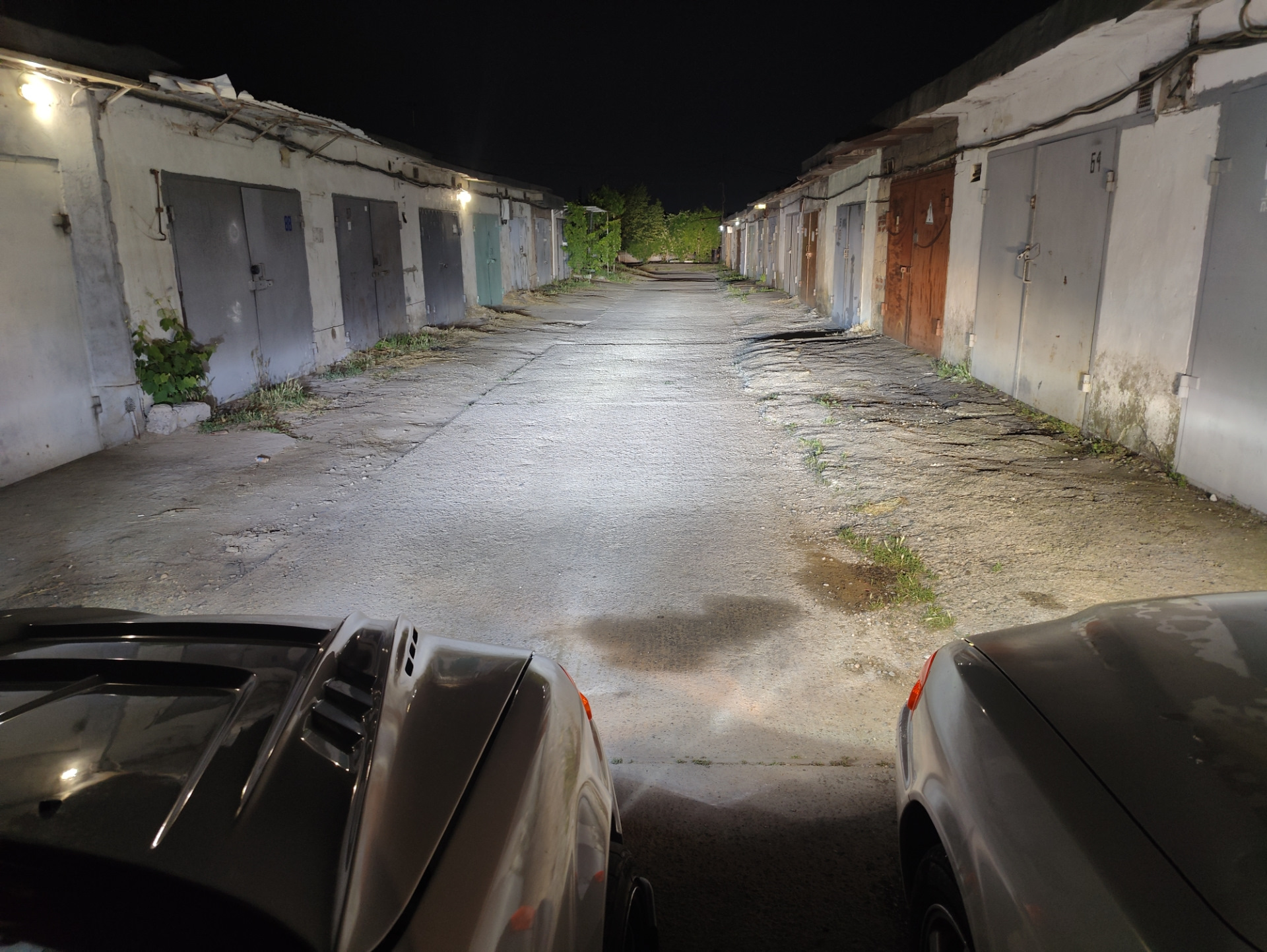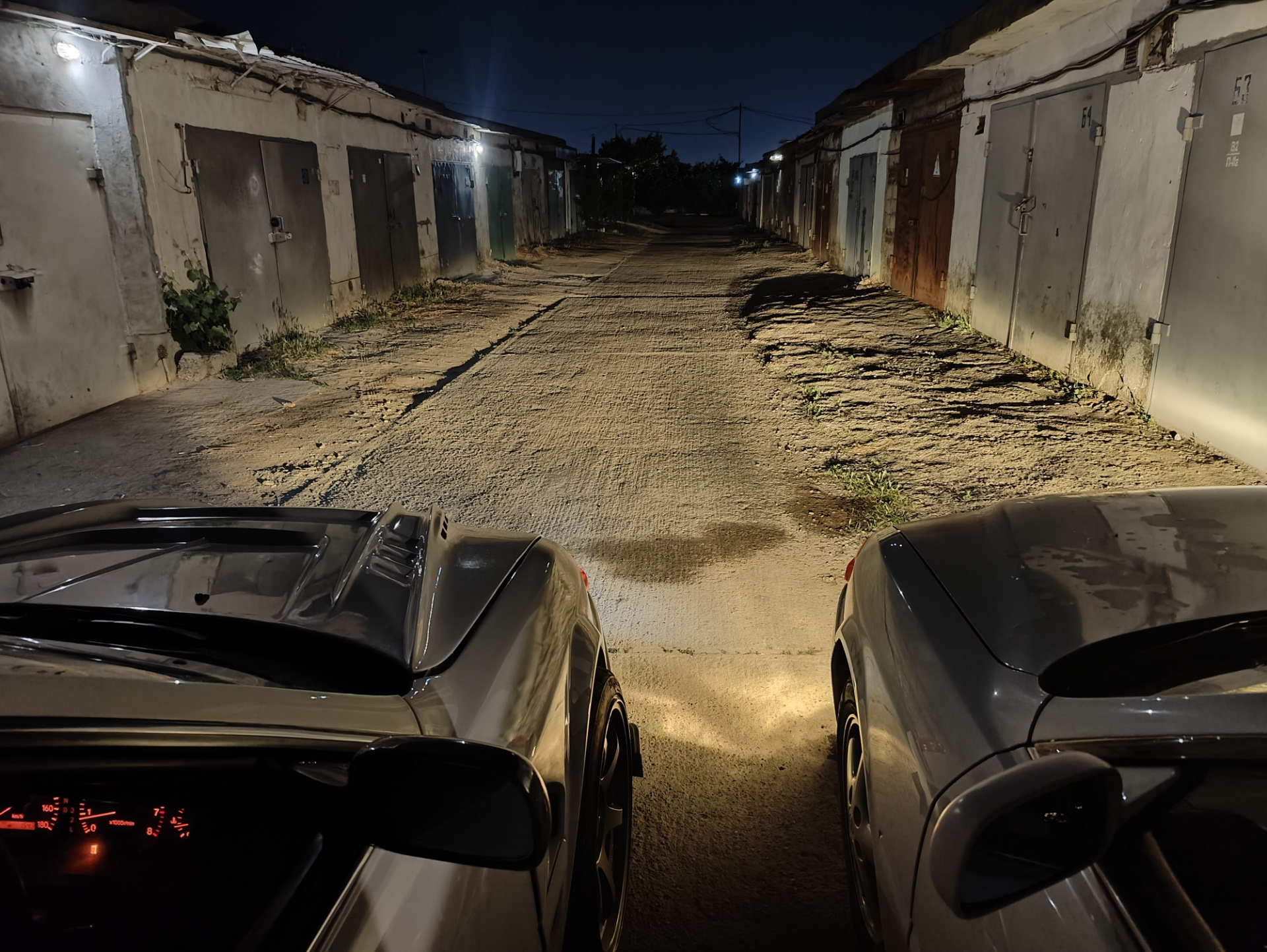 Я пытался сделать фото от света ксенона на дорогу на тёмном участкн, но телефон от усталости выпал из рук, и фото получилось смазанным, но какое есть…