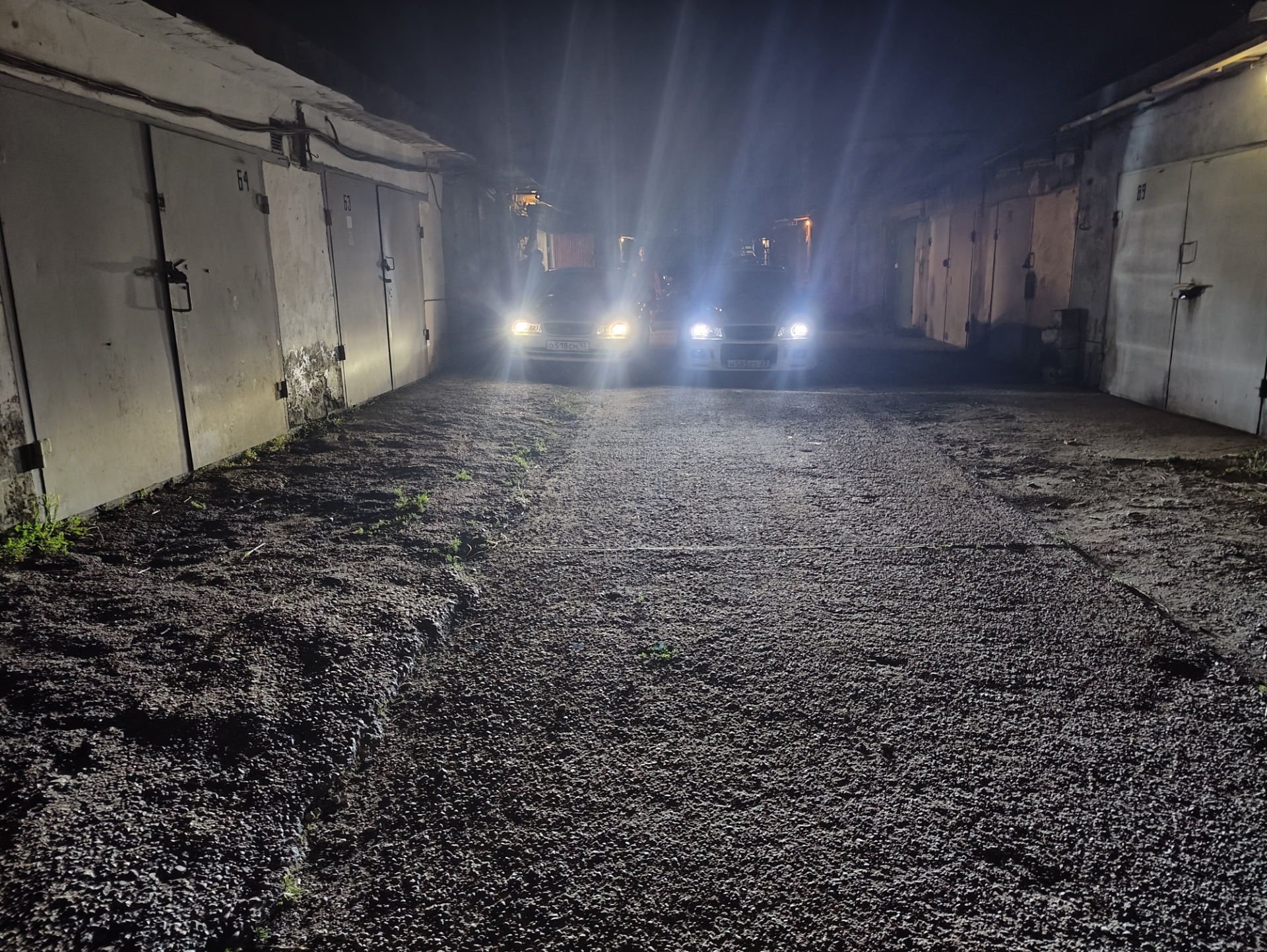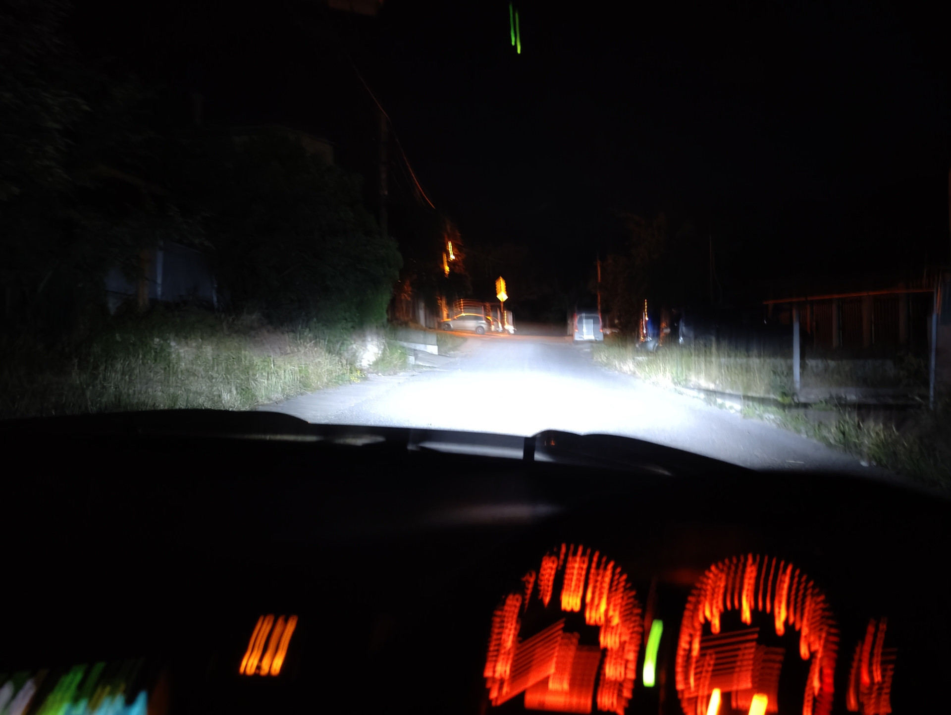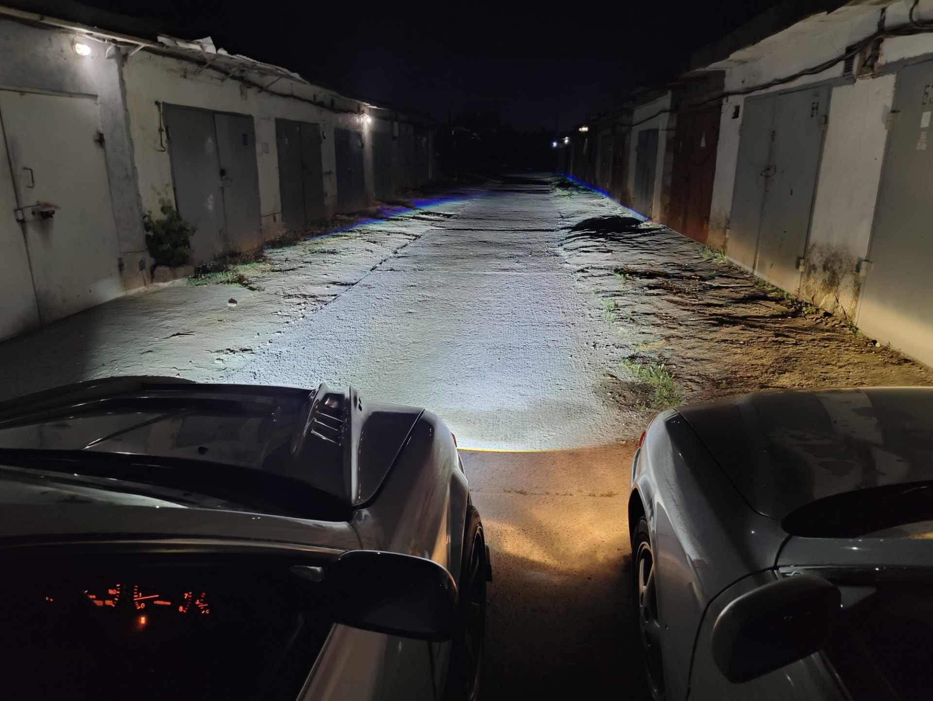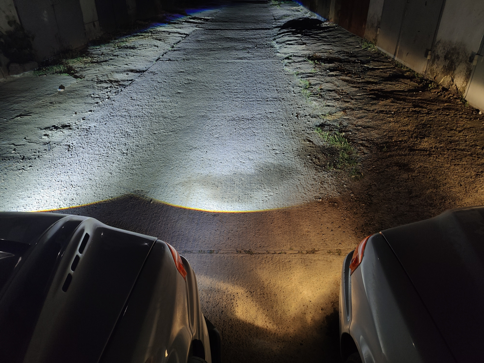 Я пытался сделать фото от света ксенона на дорогу на тёмном участкн, но телефон от усталости выпал из рук, и фото получилось смазанным, но какое есть…