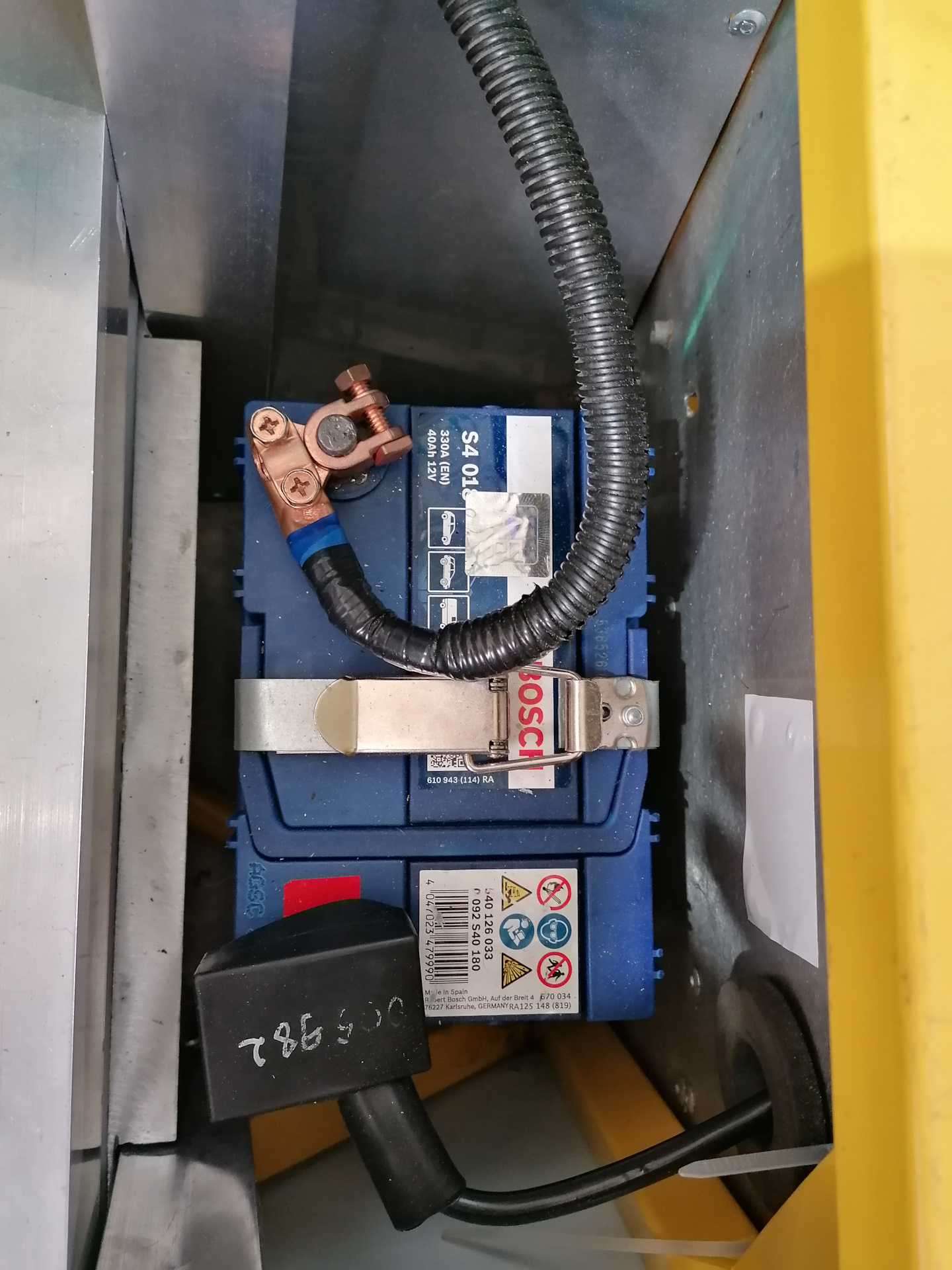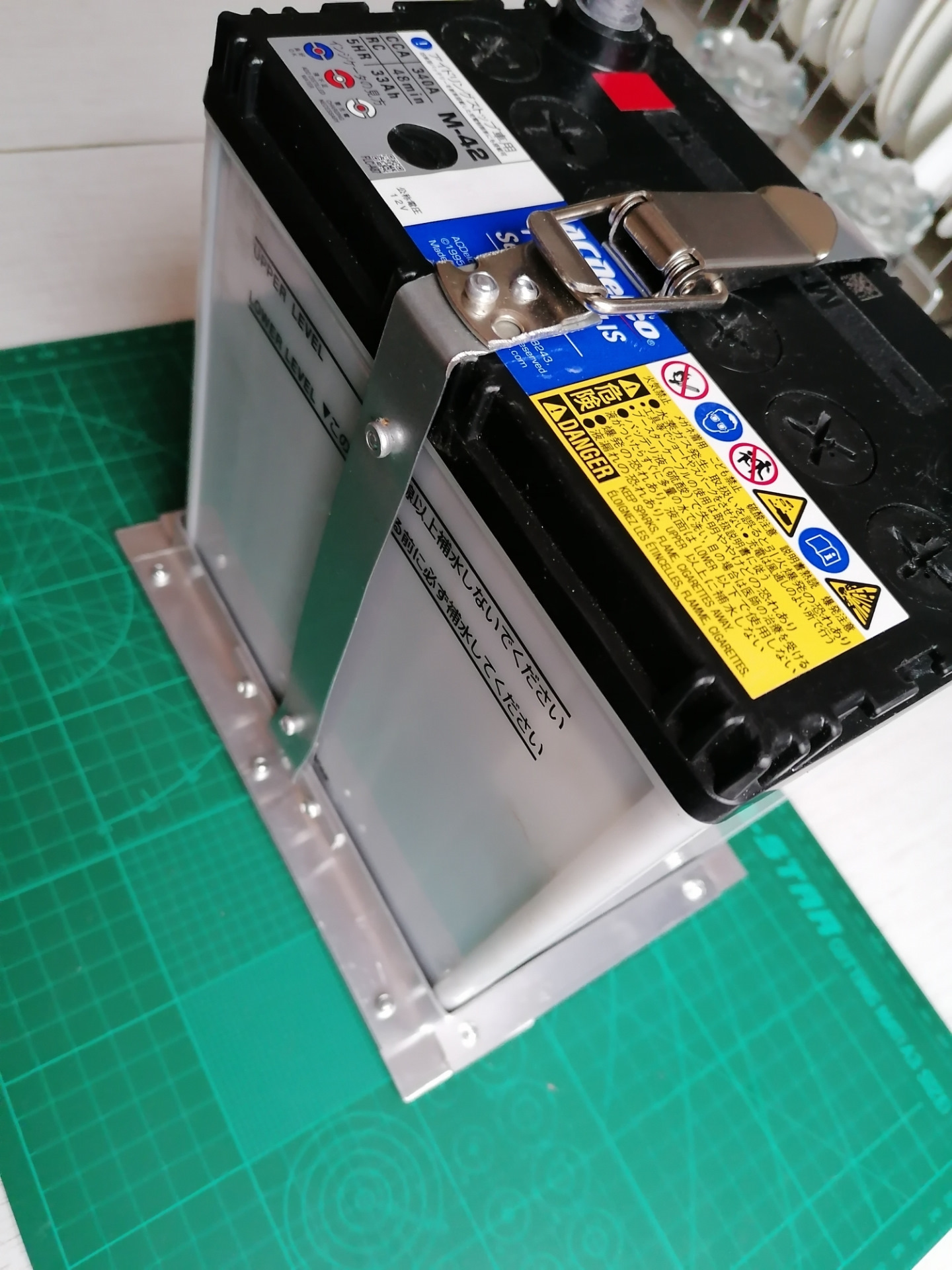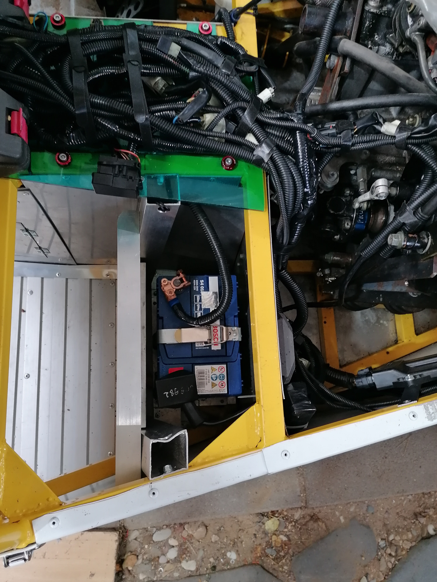 Изначально батарейка жила в моторном отсеке. В жаре и тесноте. Размер стакана с обрывком резинового ремешка говорил о мото размере амперчасов на 12. Решил поставить аккум побольше, и выгородил для него место в ногах пассажира.Там ему уютно и безопасно, огорожен со всех сторон. Но и доступ сверху к нему свободный. Корзинку под него склепал из алюминиевого т профиля. Крутит мотор весело. Особенно пригодилось в первые выезды, когда постоянно глох на первой.