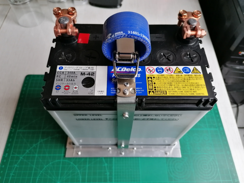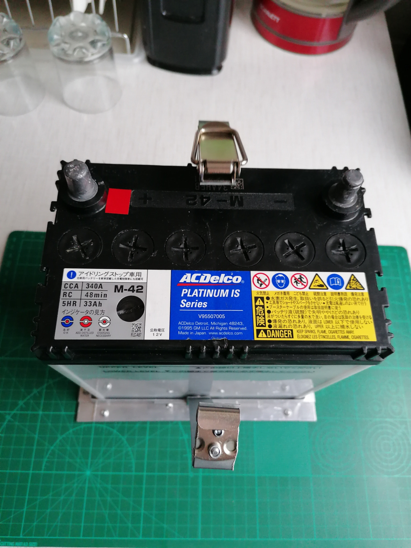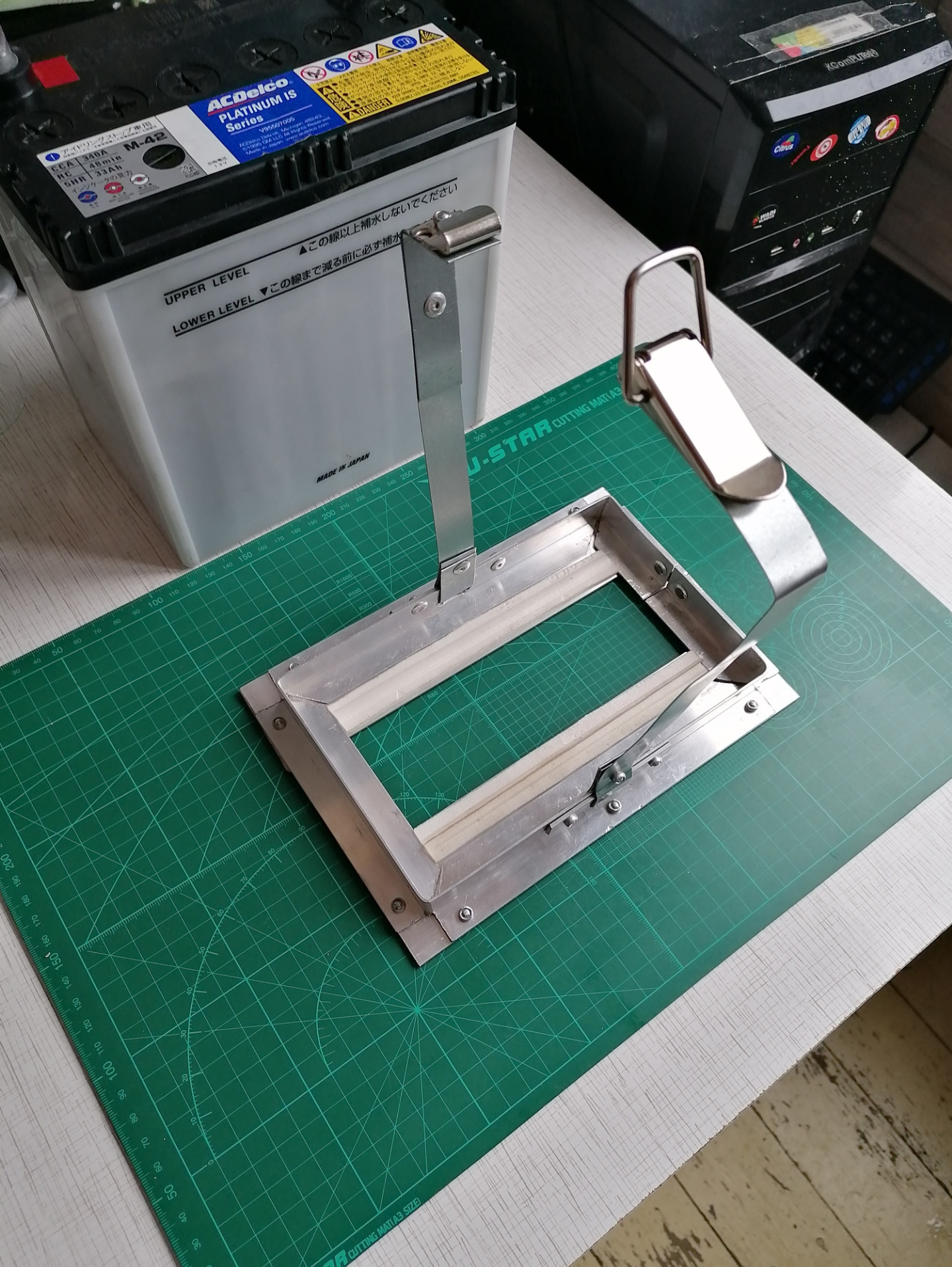 Изначально батарейка жила в моторном отсеке. В жаре и тесноте. Размер стакана с обрывком резинового ремешка говорил о мото размере амперчасов на 12. Решил поставить аккум побольше, и выгородил для него место в ногах пассажира.Там ему уютно и безопасно, огорожен со всех сторон. Но и доступ сверху к нему свободный. Корзинку под него склепал из алюминиевого т профиля. Крутит мотор весело. Особенно пригодилось в первые выезды, когда постоянно глох на первой.