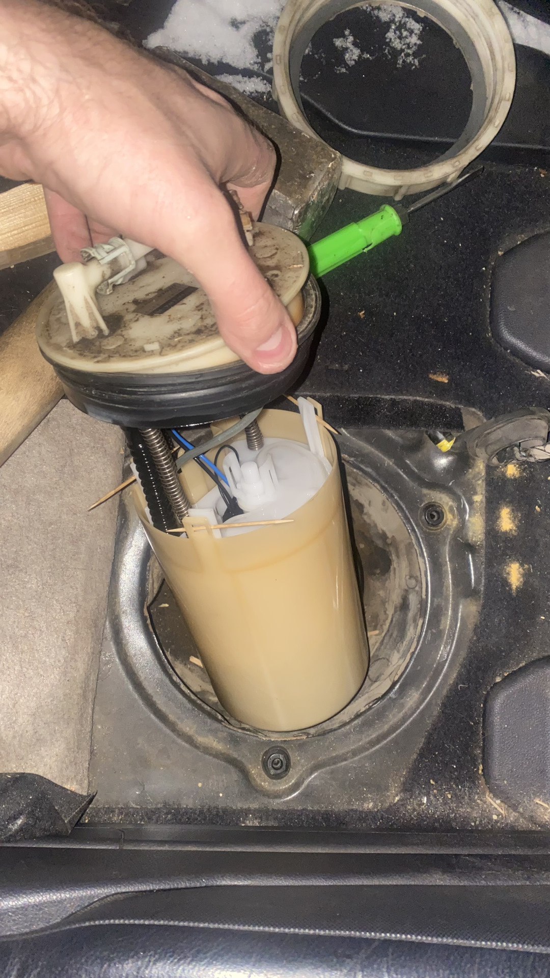 менял насос уже в квартире. боялся сломать защелки на морозе. и если вытащить фильтр из стакана ещё возможно, то вот вытащить из защелок бензонасос. даже в тепле и с подогревом бытовым феном. оказалось не просто.
