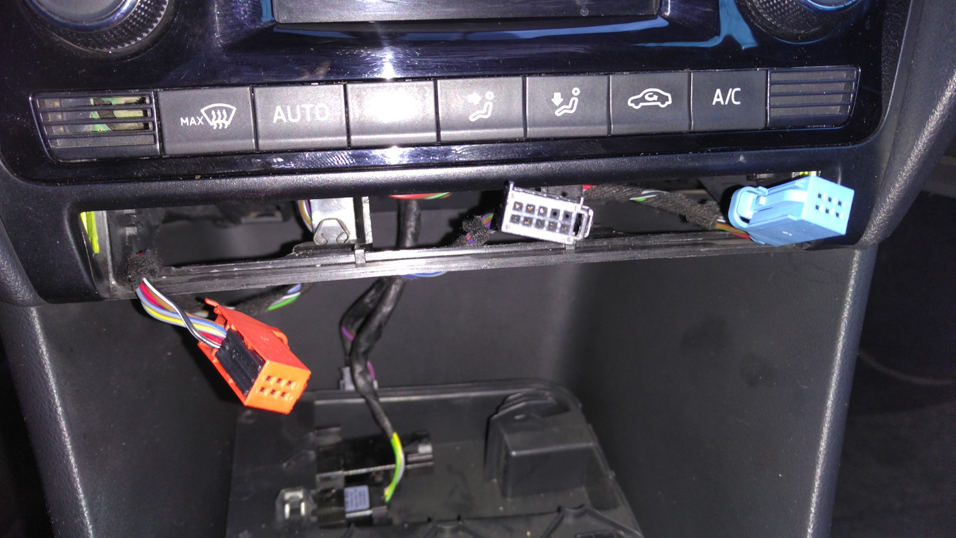 1) В центральном черном 10-pin-разъеме T10r (VAG 6R0972930) подключения модульного блока кнопок должны быть свободны два слота: 3й и 10й, к которым протягиваем два провода от ЭБУ парктроника: