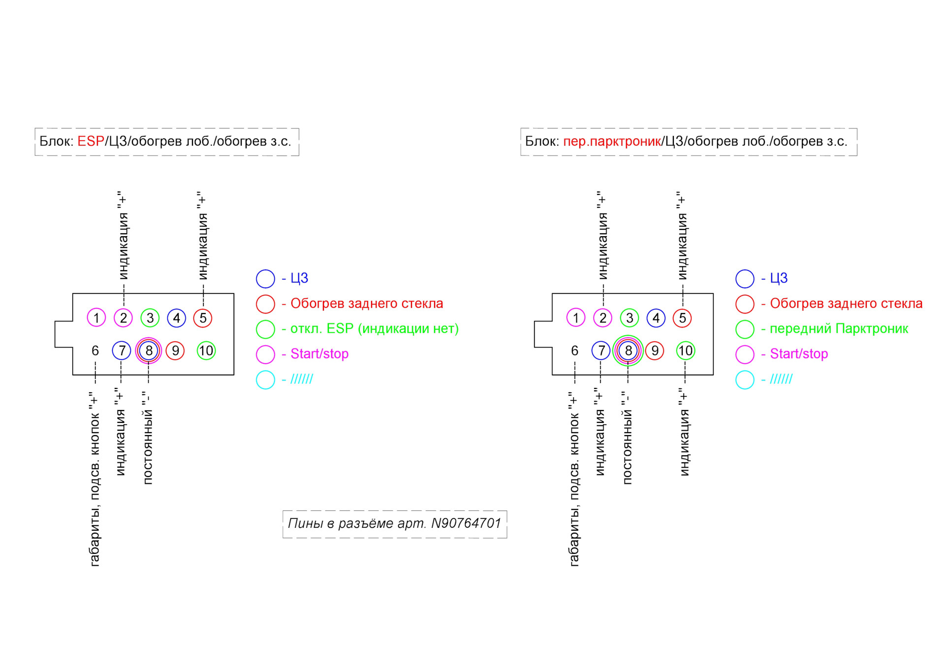 ВАЖНО! До перепиновки разъема подключения новый модульный блок кнопок ставить нельзя: вероятность короткого замыкания ввиду того, что штатный блок кнопок может быть распинован под будущую установку кнопки управления ESP/ASR, схема питания которой отличается. Необходимо убедиться, что 3й и 10й слоты центрального черного 10-pin-разъема T10r (VAG 6R0972930) прежнего модульного блока кнопок свободны. Тогда можно протянуть новые два провода от ЭБУ парктроника. См. схему распиновки ниже. Если в 3й и 10й слоты 10-pin-разъема T10r уже заведены с завода пины-контакты, необходимо сперва их извлечь и заизолировать, а потом только заводить новые пины-контакты от ЭБУ парктроника. Для уменьшения помех провода рекомендуется скрутить.