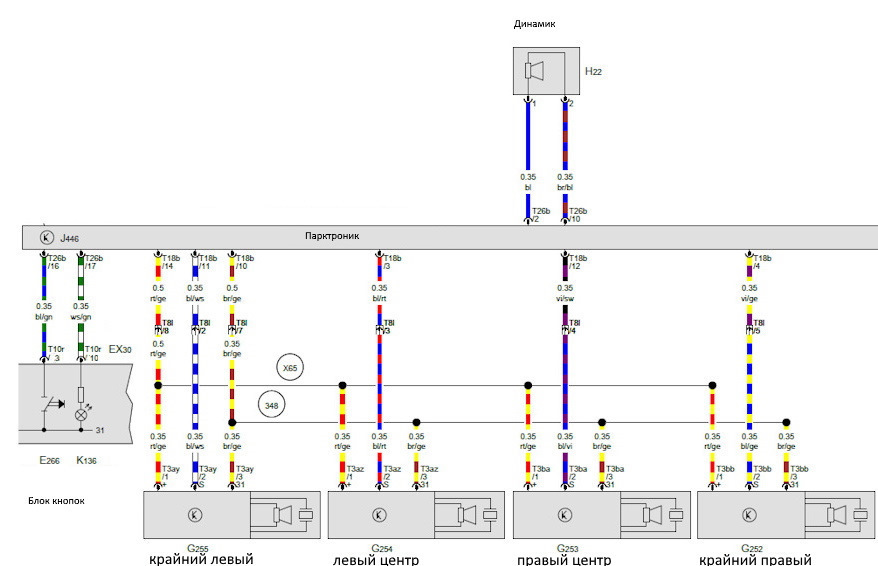T26a/16 → Т10r/3 («управляющий плюс» кнопки переднего парктроника), провод ПВАМ-0.35 серый gr или сине-зеленый bl/gn;