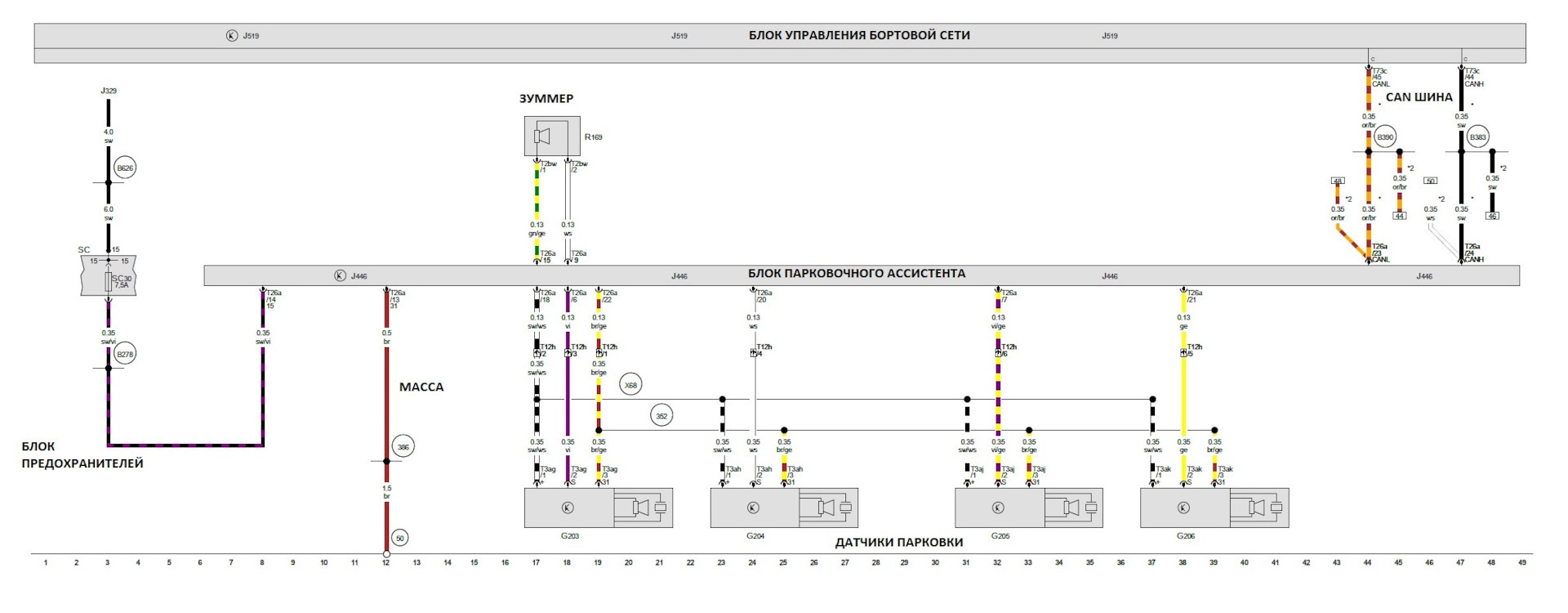 Т18b/4 → (слот 3 разъема VAG 1J0973713) → правый датчик right-out, провод ПВАМ-0.35 фиолетово-желтый vi/ge;