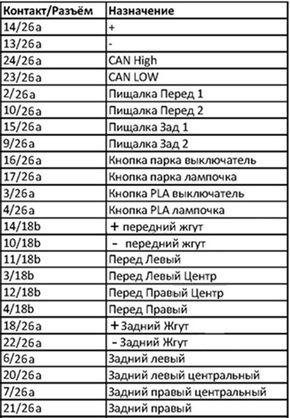 Пины-контакты 6, 7, 18, 20, 21 и 22 разъема T26a (питание заднего парктроника) оставляем.
