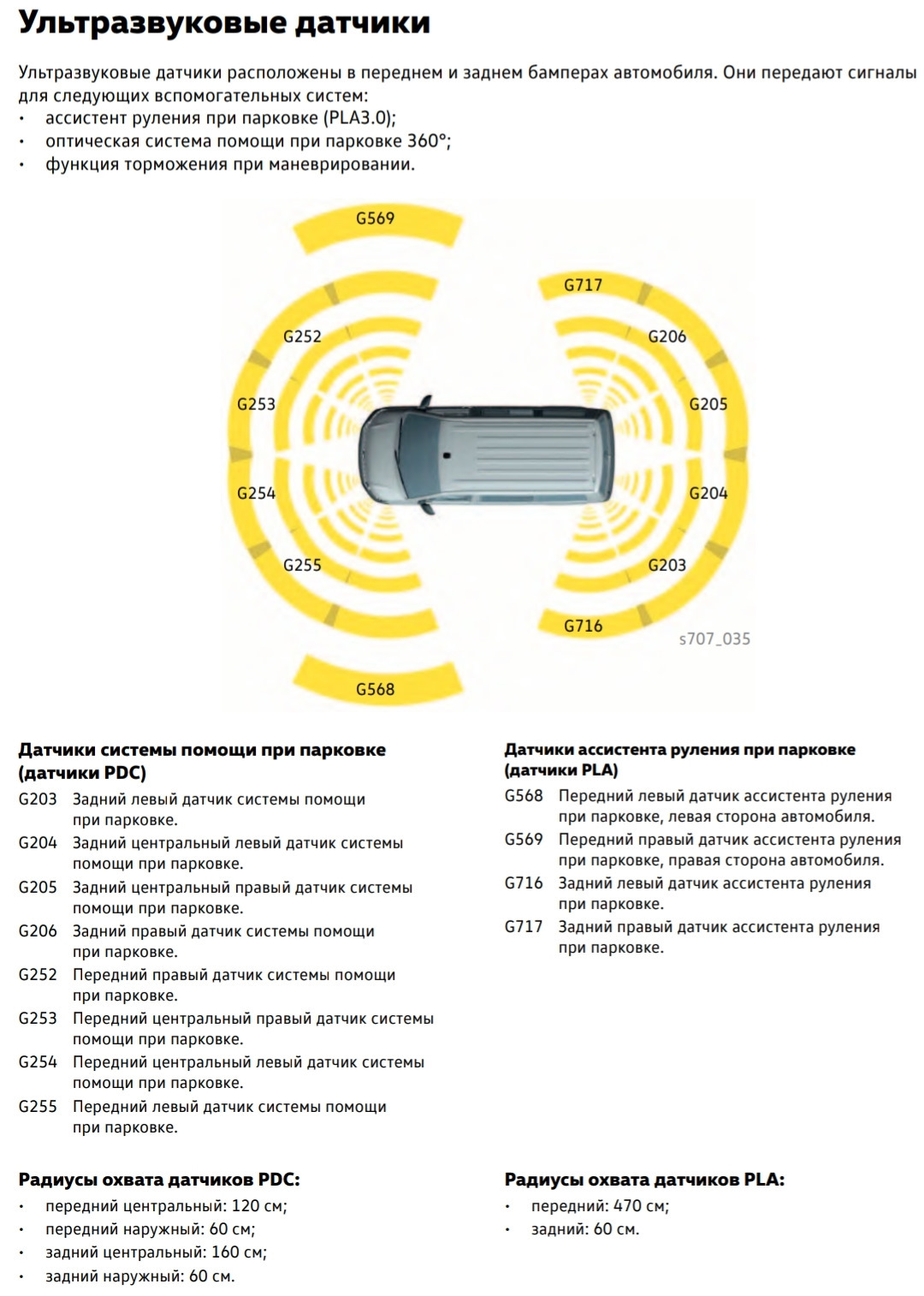 3) [PR-7X5] 12-канальный ЭБУ Valeo «Parkhilfe PLA» с восемью УЗ датчиками парктроников сзади и спереди, а также четырьмя дополнительными боковыми датчиками ассистента автоматической парковки PLA 3.0 с обозначениями G568-G569 и G716-G717.