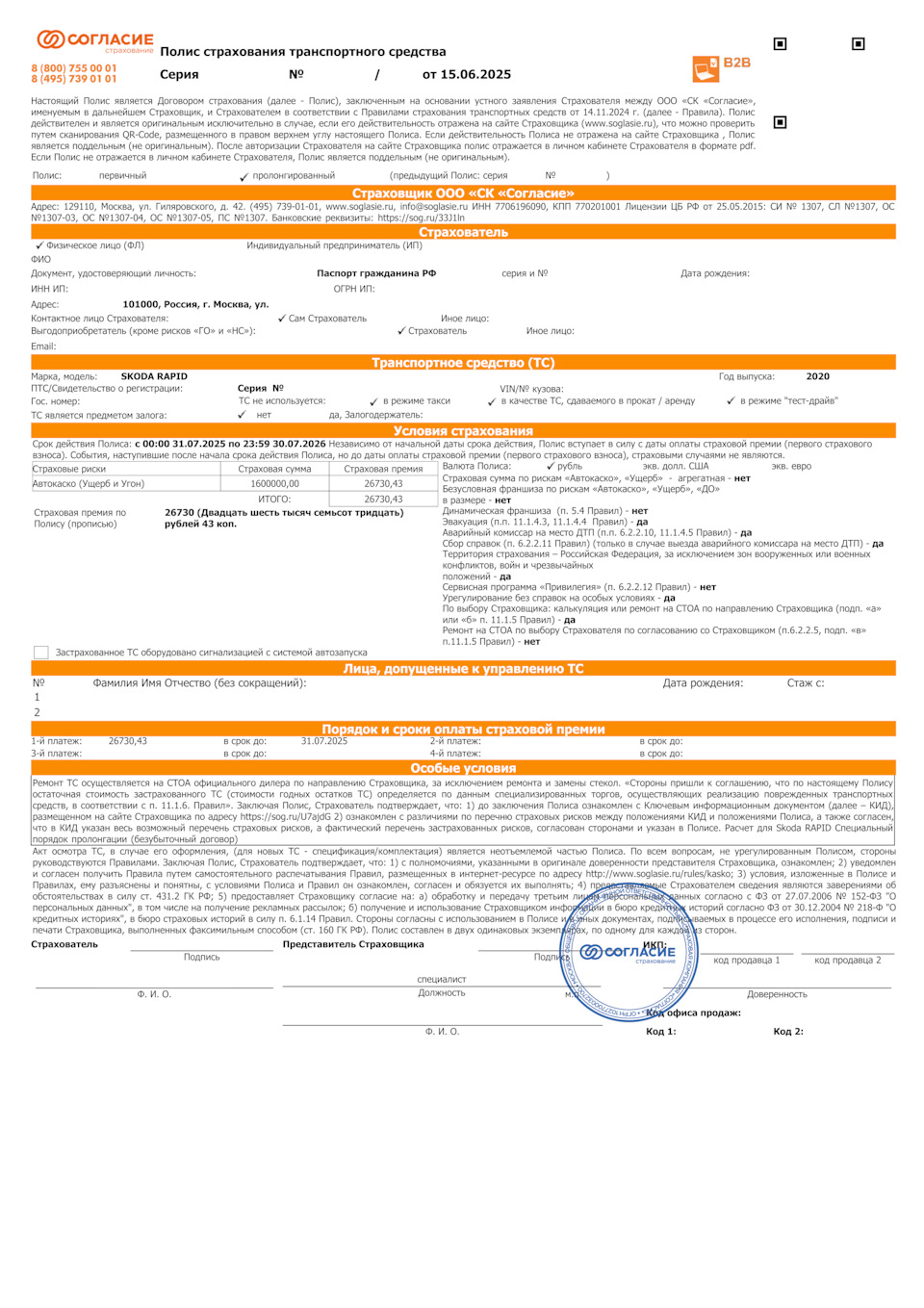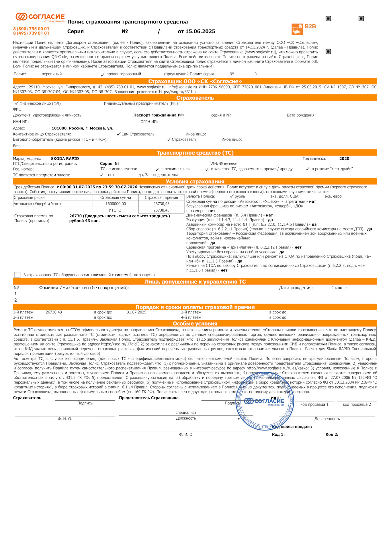 Вчера вечером, заранее, за полтора месяца до окончания действующего полиса, продлил полис КАСКО на 2025 — 2026 гг.