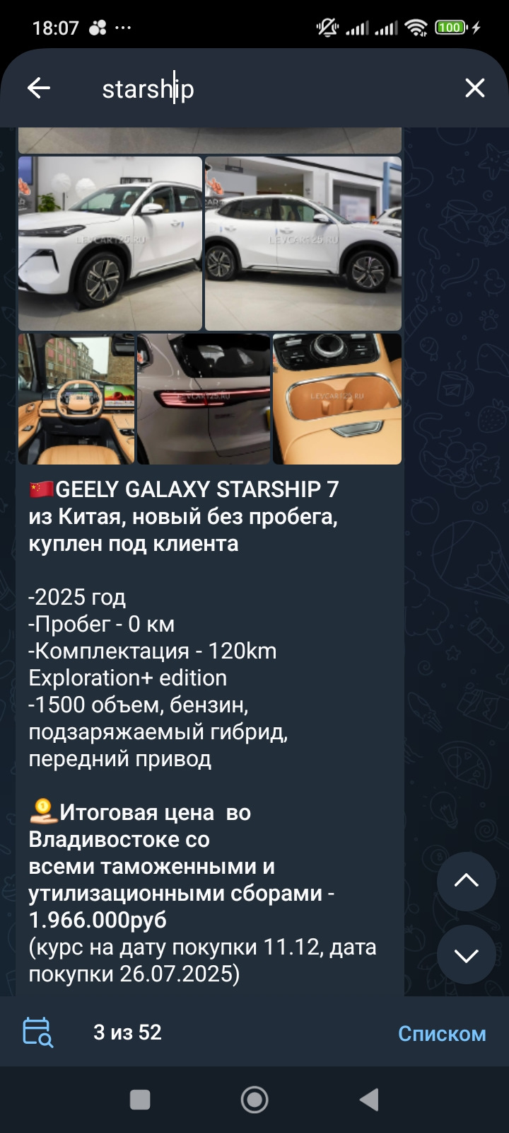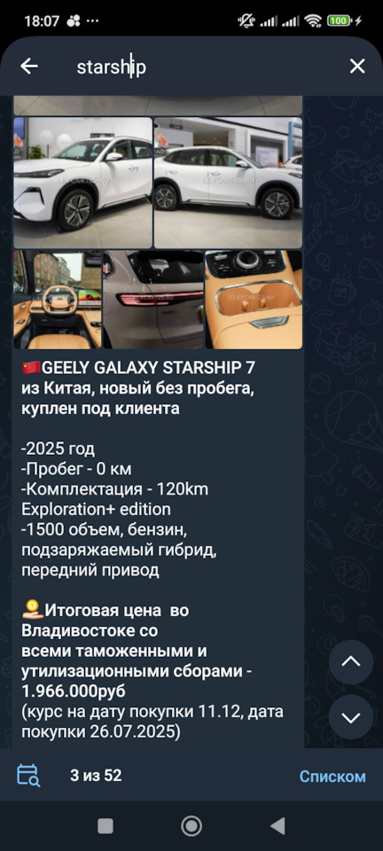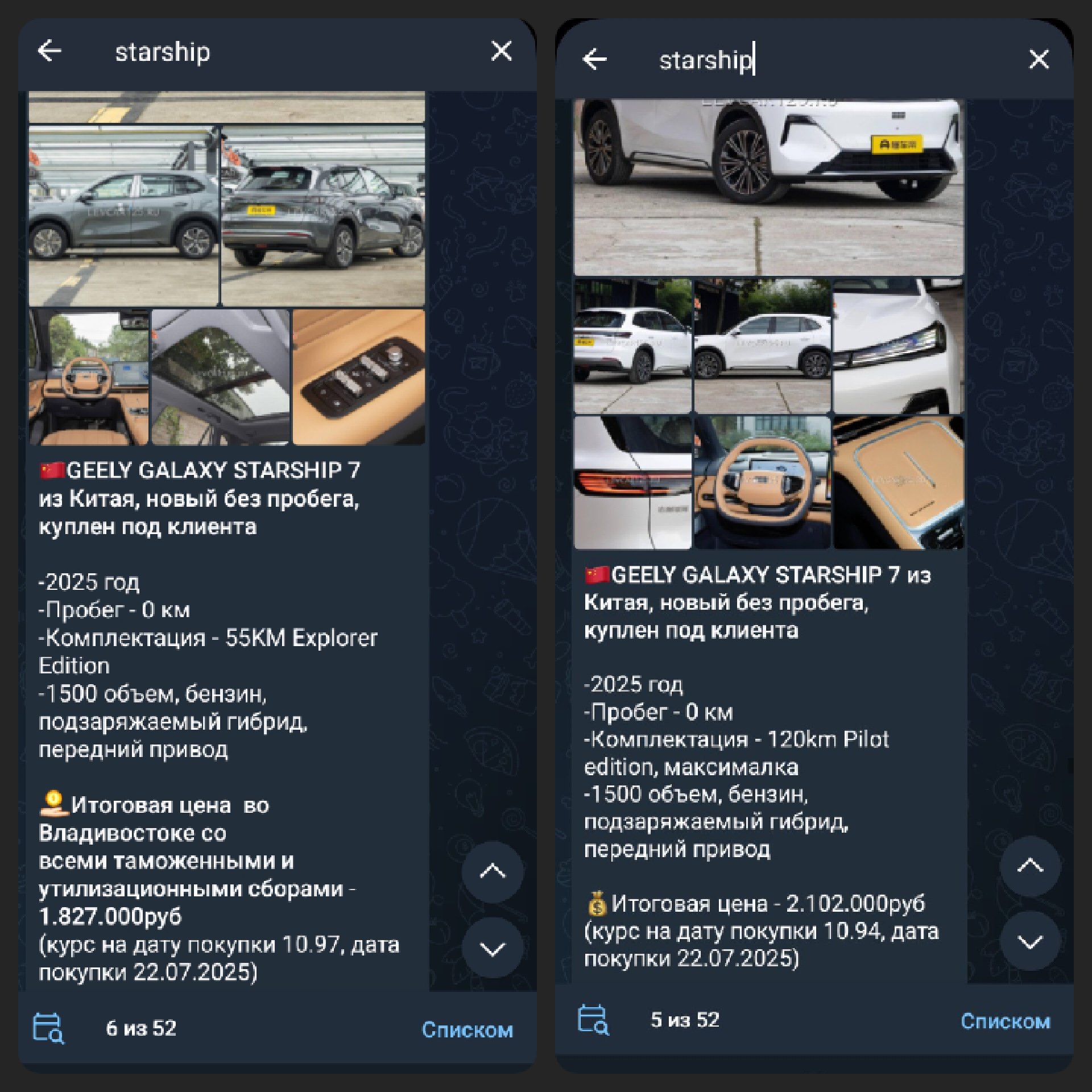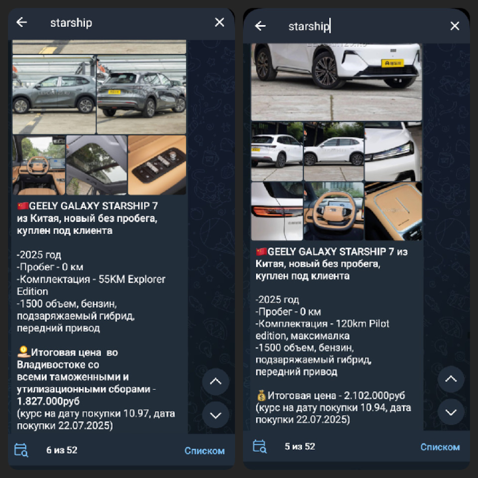 Geely Galaxy Starship 7 EM-i 120 km Pilot Edition 2025 1.5 Hybrid 175 1499 DHT 2WD Pilot Edition CNY ¥110 000,00 2 093 034 ₽