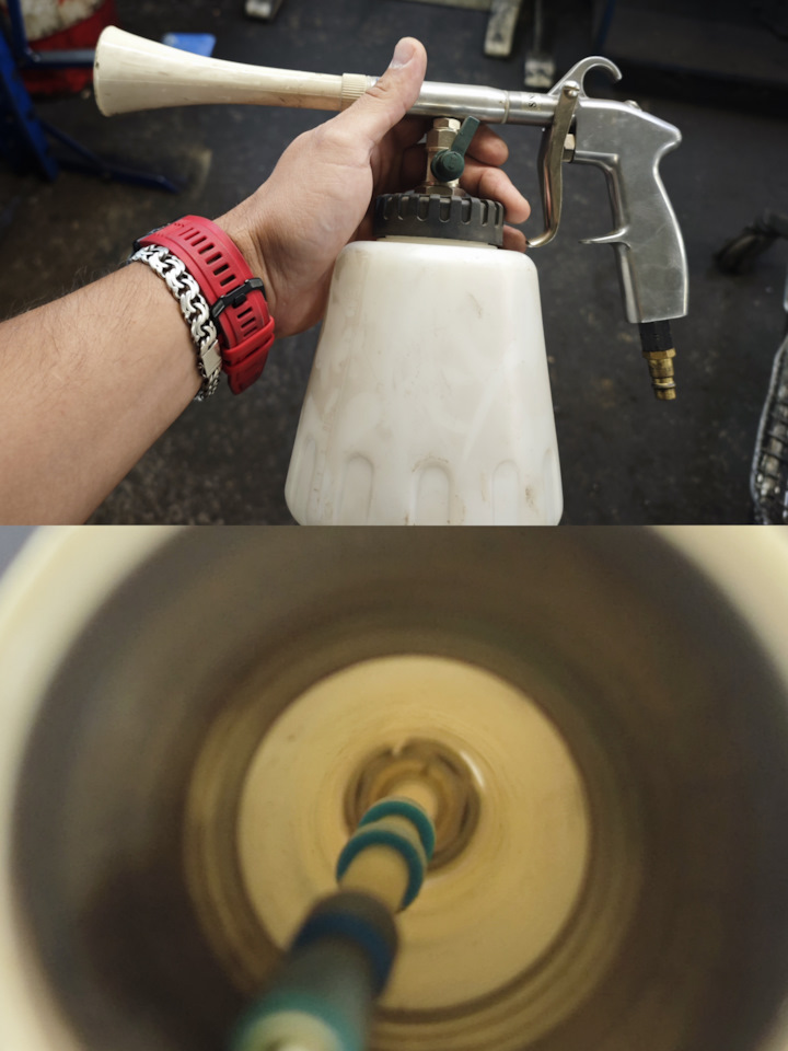 Дальше смотря что именно делать, можно просто продуть воздухом без химии, потом протереть салон, можно вкл с подачей жидкости, нанести химию на обрабатываемую поверхность.