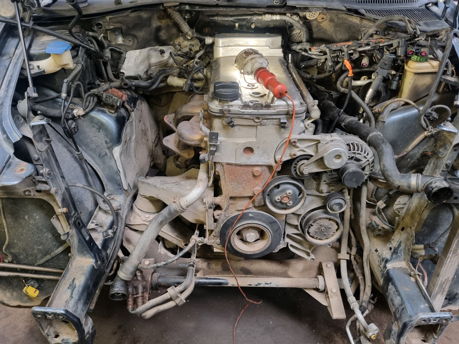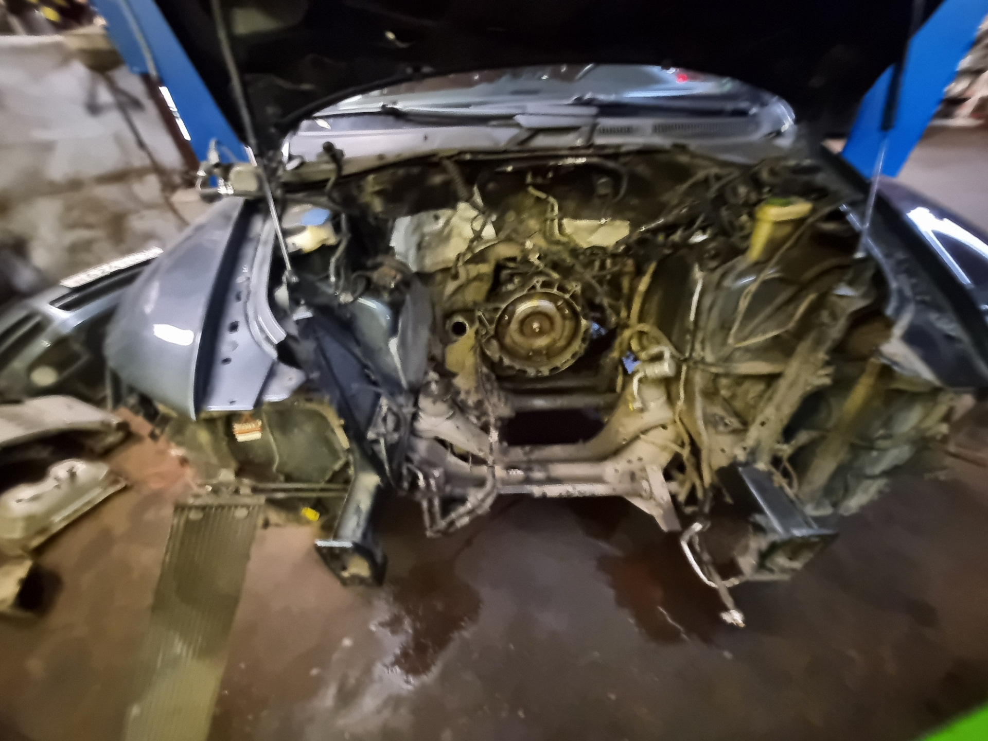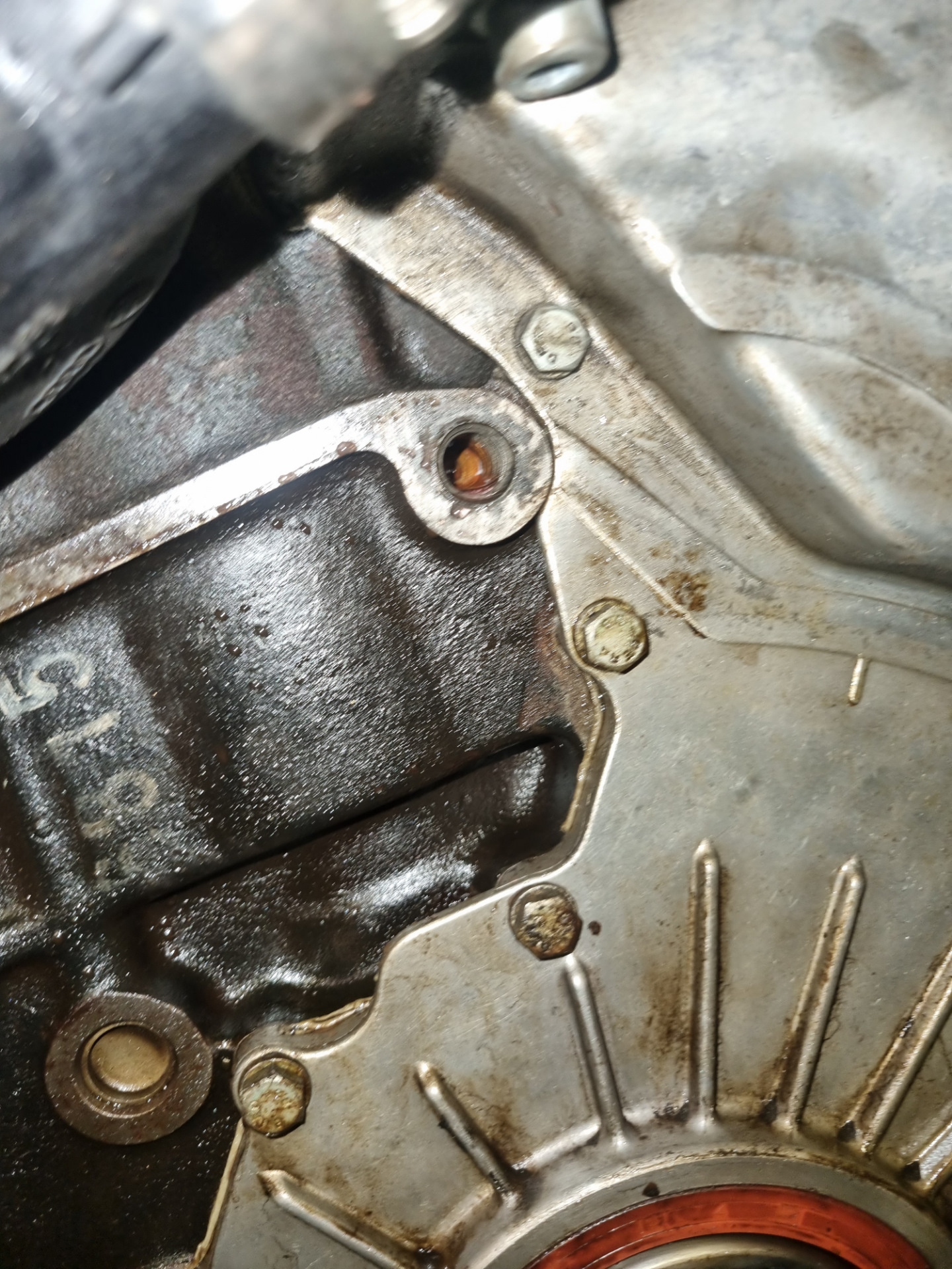 Ну дальше все по накатаной тропке, так как это уже не первая машина с мужским продольным мотором, действовать знаю как. Из нюансов обнаружилось только частичное отсутствие телевизора, кучу саморезов и изломаного крепежа, позже все заменю… ну самым плохим моментом было то, что предыдущие "мастера" руки-ноги у которых перепутали один единственный болт другого размера сверху мотора под задним фланцем и загнали его с гайковерта и угадайте, что произошло? Верно. Проломили рубашку охлаждения, фриз потек, ну ладно, что делать, вычистим и на фиксатор резьбы поставим.