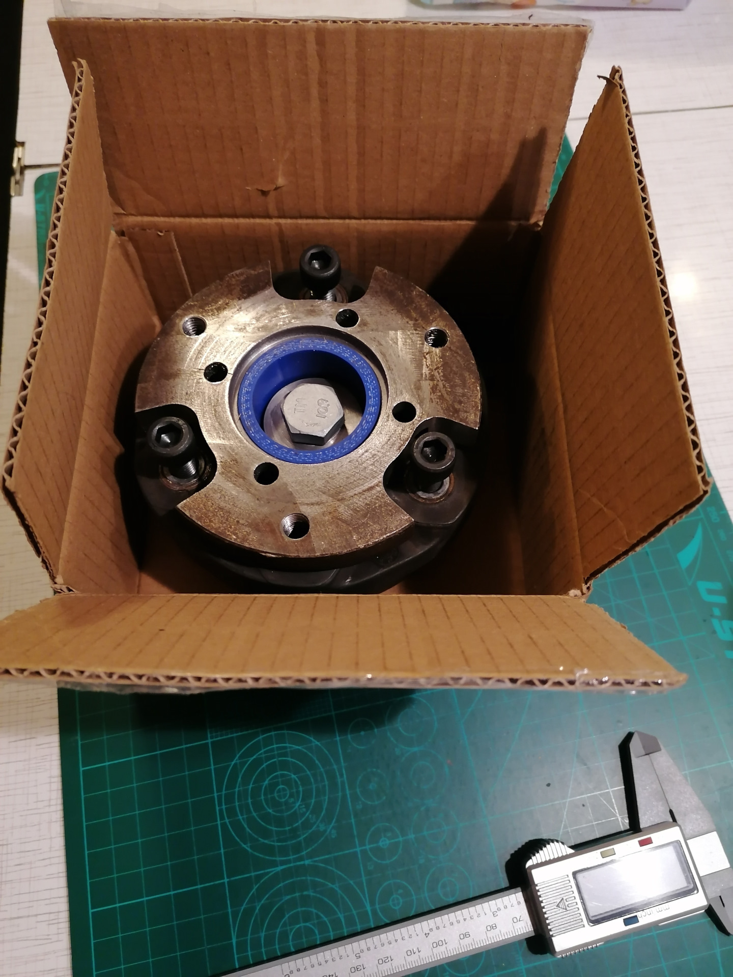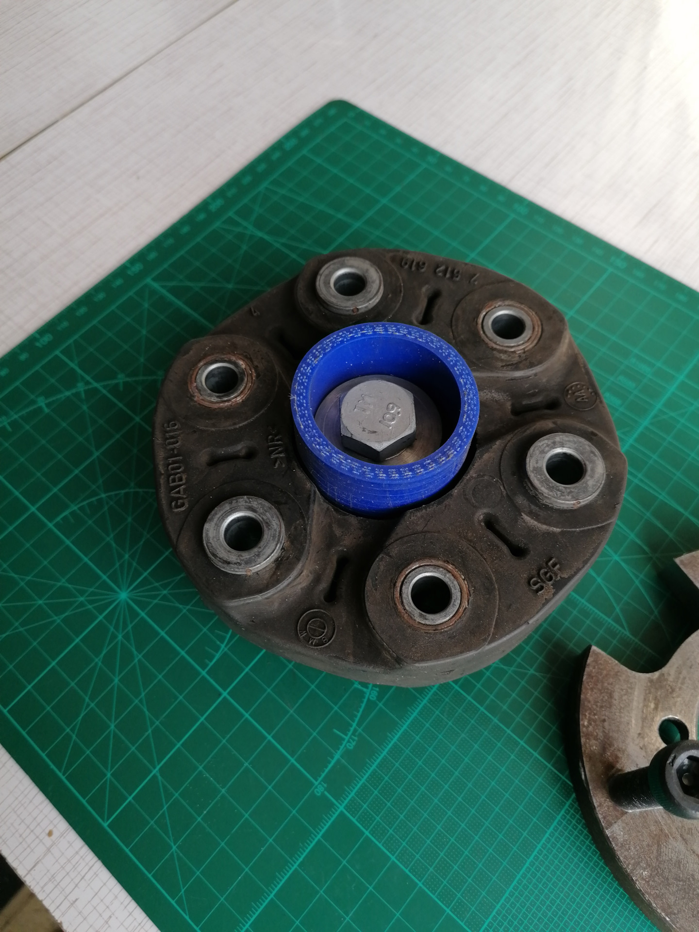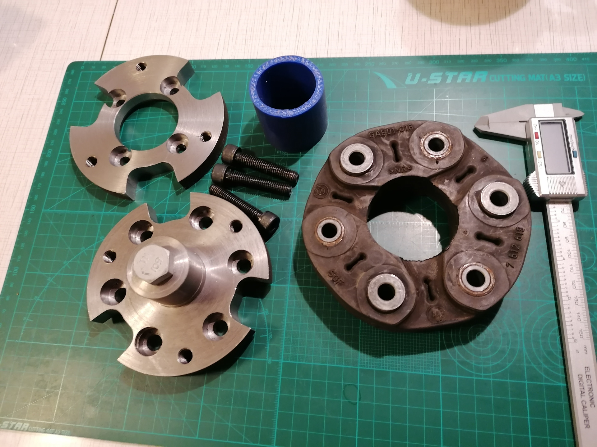 Как я уже писал ранее, кардан наверно и спас машину. Прошлые хозяева гоняли на Интрудере с сухим задним мостом. Но неправильно придуманный задний кардан на определенных оборотах уходил в адский пляс. Амплитуда, с которой он размахивал тяжеленным маховиком достигала 5 (!) сантиметров. Стук такой кувалды в район кресла видимо отбил окончательно желание погонять. Поняв, что с ним не так, я решил его переделать. Изначально между редуктором и карданом была задумана эластичная муфта от БМВ. Но вместо изящных трех лап у немцев, тут были толстенные тяжеленные блины. Самое главное, что не было центрального штифта, который гасил бы радиальные побеги кардана. Оттокарил и отфрезеровал лишнее. В центре разместил шип с куском шланга в виде демпфера. Общая длина кардана сократилась на 4 сантиметра, что отпустило зажатый ранее шлицшарнир. Кардан перестал стоять враспор между задним мостом и реверсбоксом.