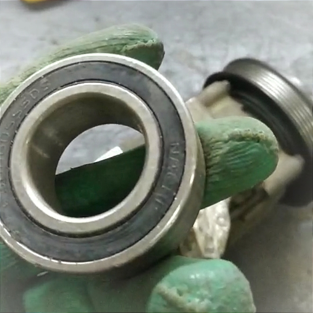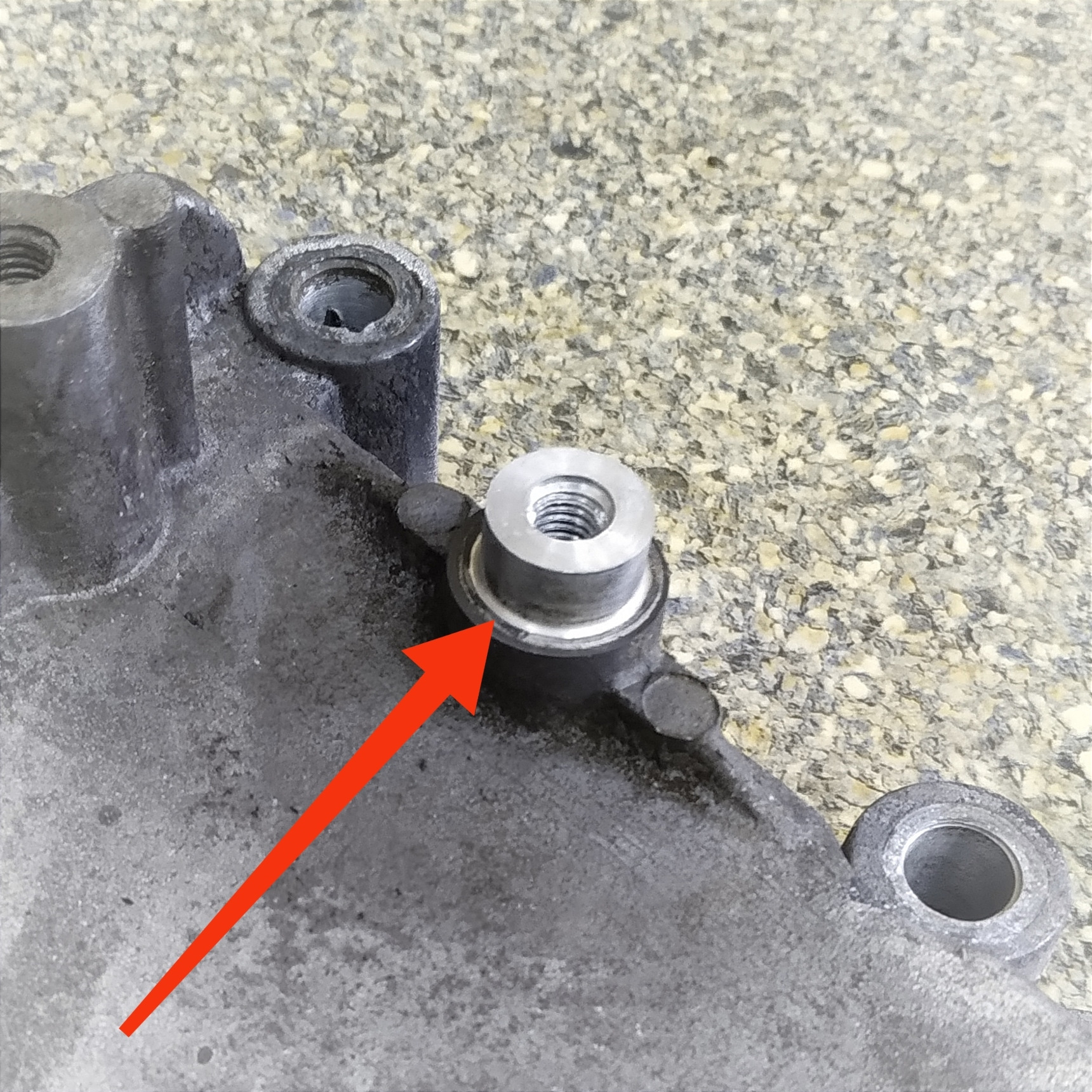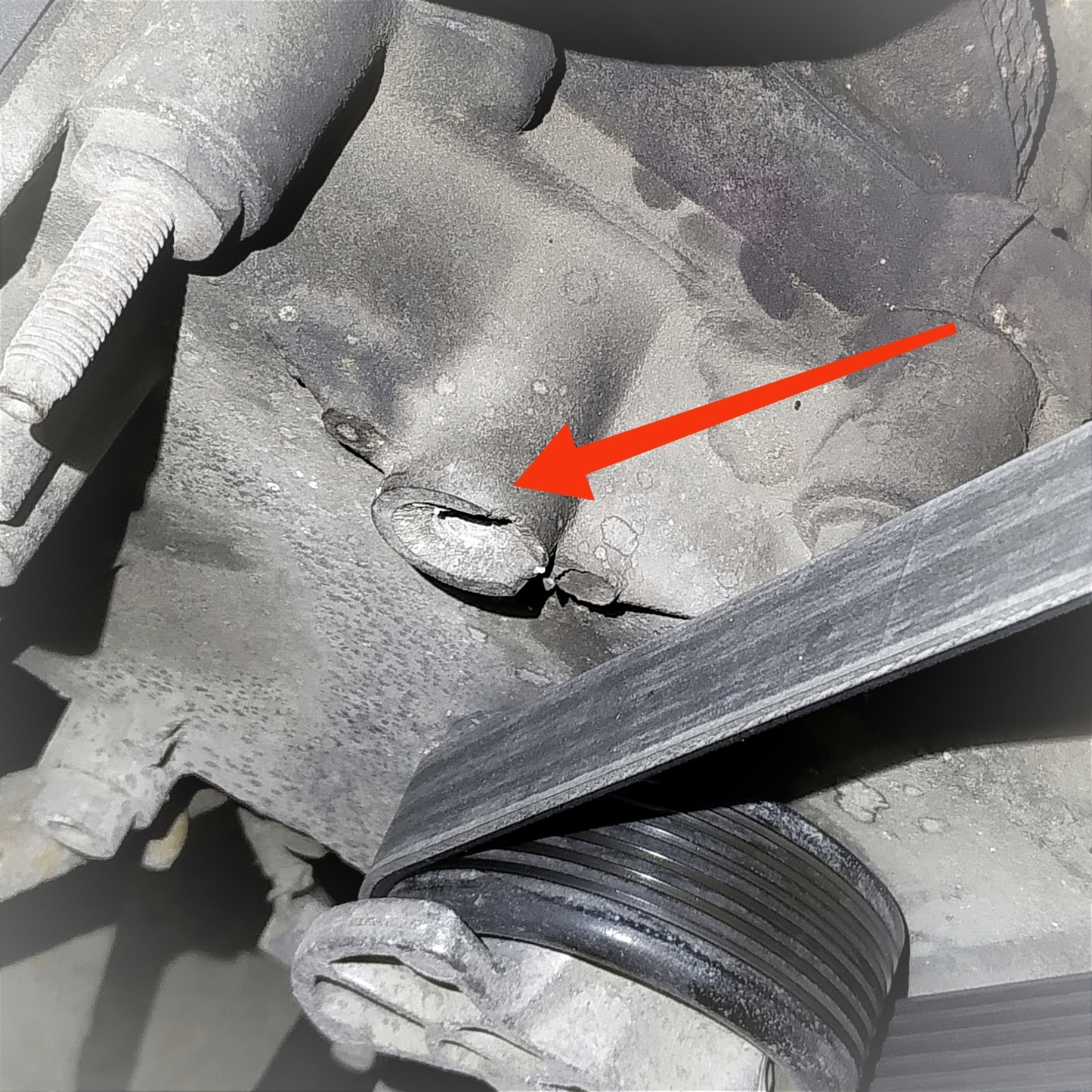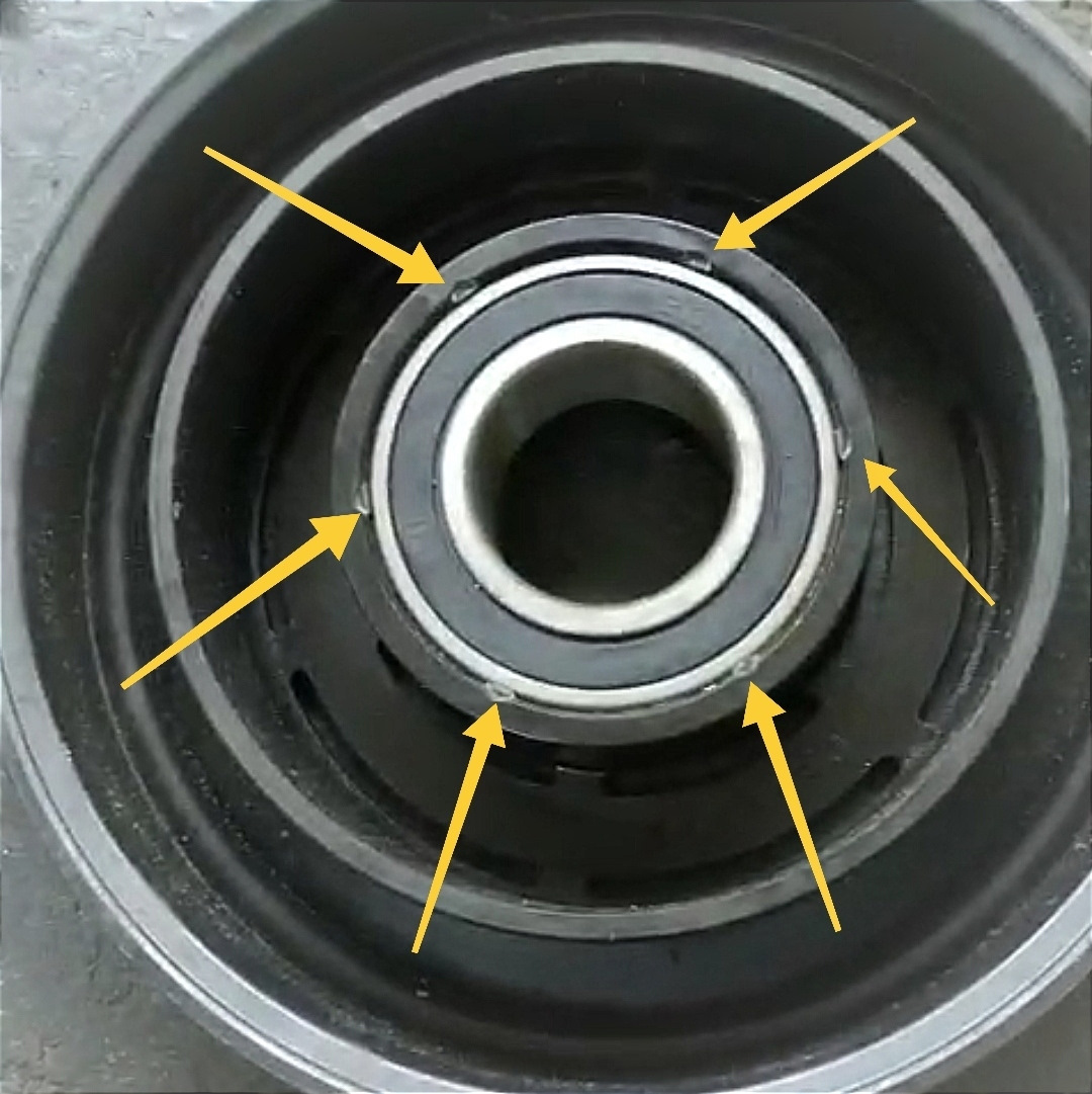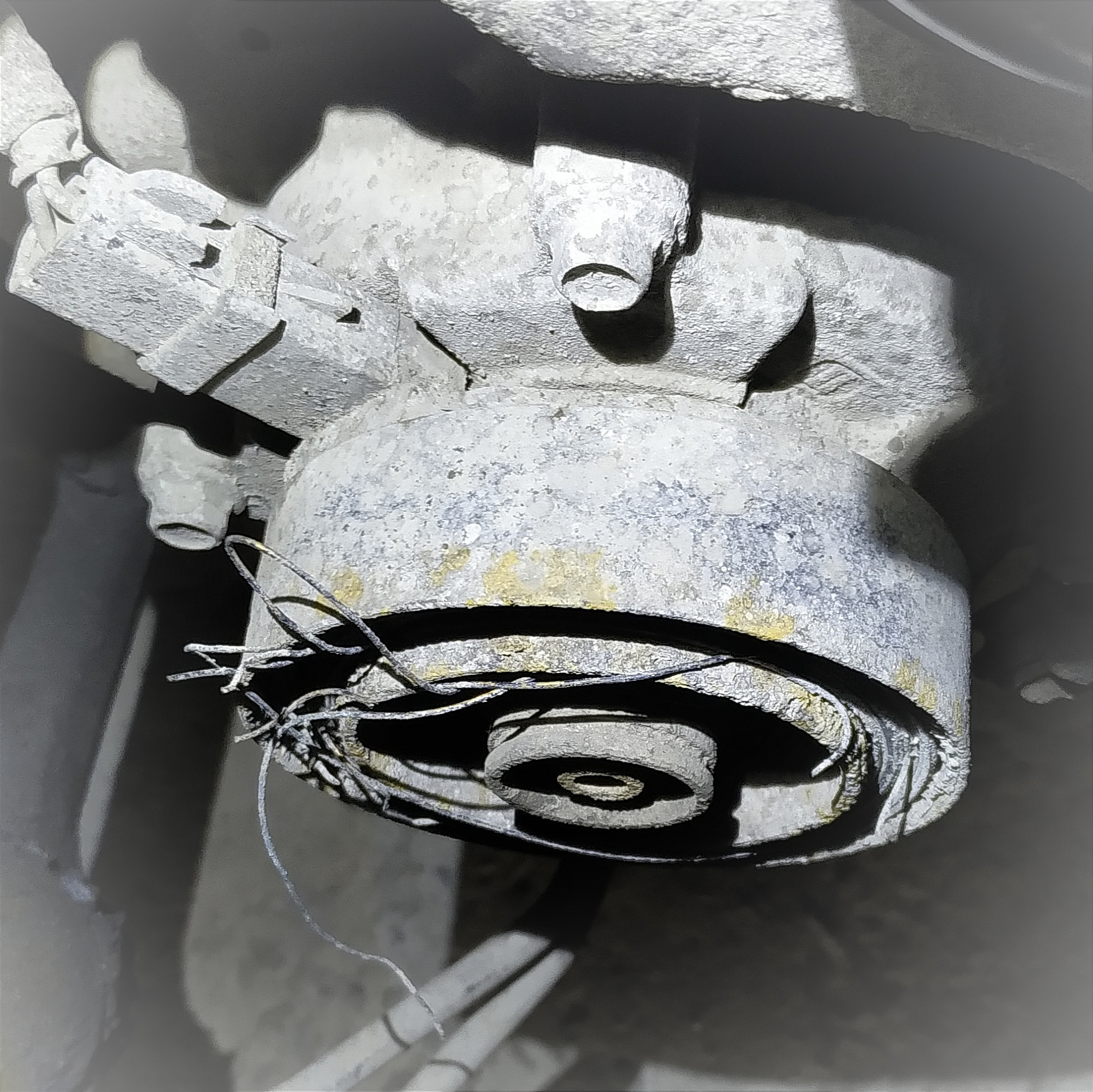 Внутренняя ось компрессора не вращалась. Вероятно, когда-то компрессор заклинило при вращающемся двигателе, а это, в свою очередь, спровоцировало резкое повышение нагрузки на обводной ролик, вследствие чего его оторвало вместе с посадочным местом.