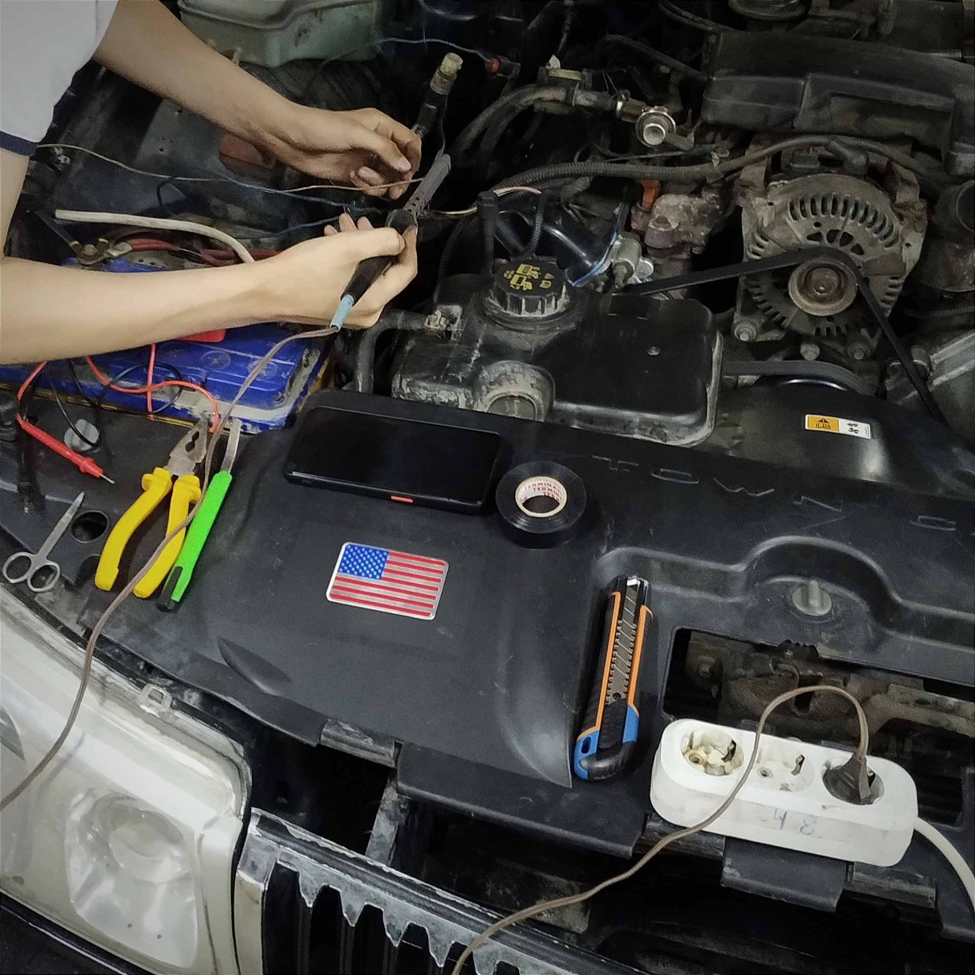 Отдаю машину в сервис на опрессовку и заправку. Мастер молодец, всё подсоединил, дал давление на 3 часа и убедился, что система исправно его держит. Как я и предполагал, помимо физических неисправностей есть ещё и какие-то электрические. Проблема в том, что блок климата не управляет компрессором и вентилятором охлаждения радиатора. Установив перемычки вместо двух реле, заставили вентилятор вращаться и включили муфту компрессора. Прежде всего это было сделано для того, чтобы получилось заправить систему, а также для понимания, функционирует ли система вообще. И вот, впервые за многие годы (я уверен, что кондиционер в нерабочем состоянии уже не один год) из панели подул холодный воздух, и машина резко наполнилась прохладой. Это классный момент, пусть и пока всё на перемычках.