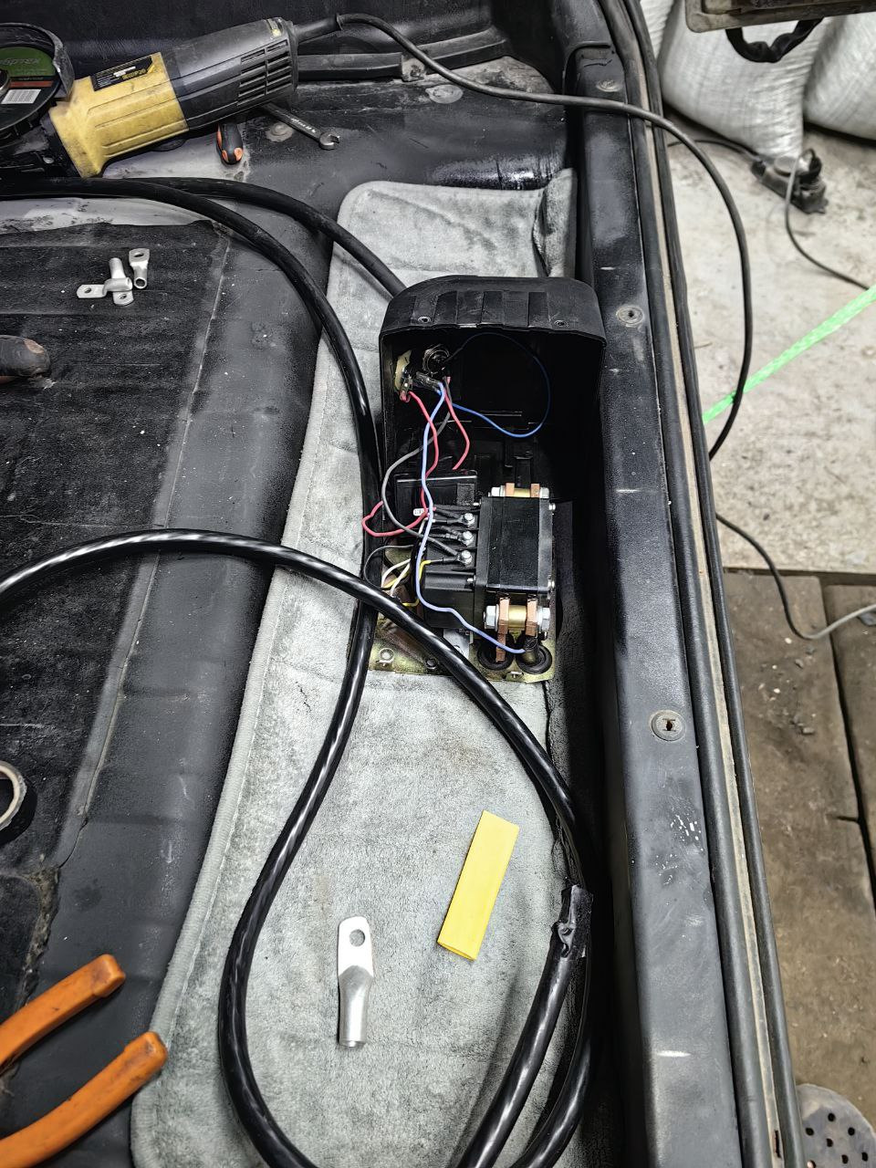 Два силовых провода подключены к клеммам, один напрямую, один через реле грюнера. Перемычка от реле грюнера до аккумулятора жесткая как лом) Провода от реле грюнера заведены в салон, подключены через резистор к нефиксируемой трехпозиционной кнопке, спрятанной в нише рядом с кнопкой туманок.