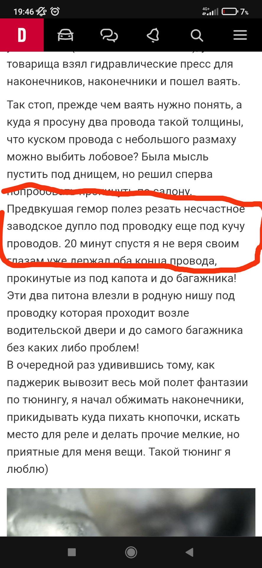 Так стоп, прежде чем ваять нужно понять, а куда я просуну два провода такой толщины, что куском провода с небольшого размаху можно выбить лобовое? Была мысль пустить под днищем, но решил сперва попробовать прокинуть по салону. Предвкушая гемор полез резать несчастное заводское дупло под проводку еще под кучу проводов. 20 минут спустя я не веря своим глазам уже держал оба конца провода, прокинутые из под капота и до багажника!