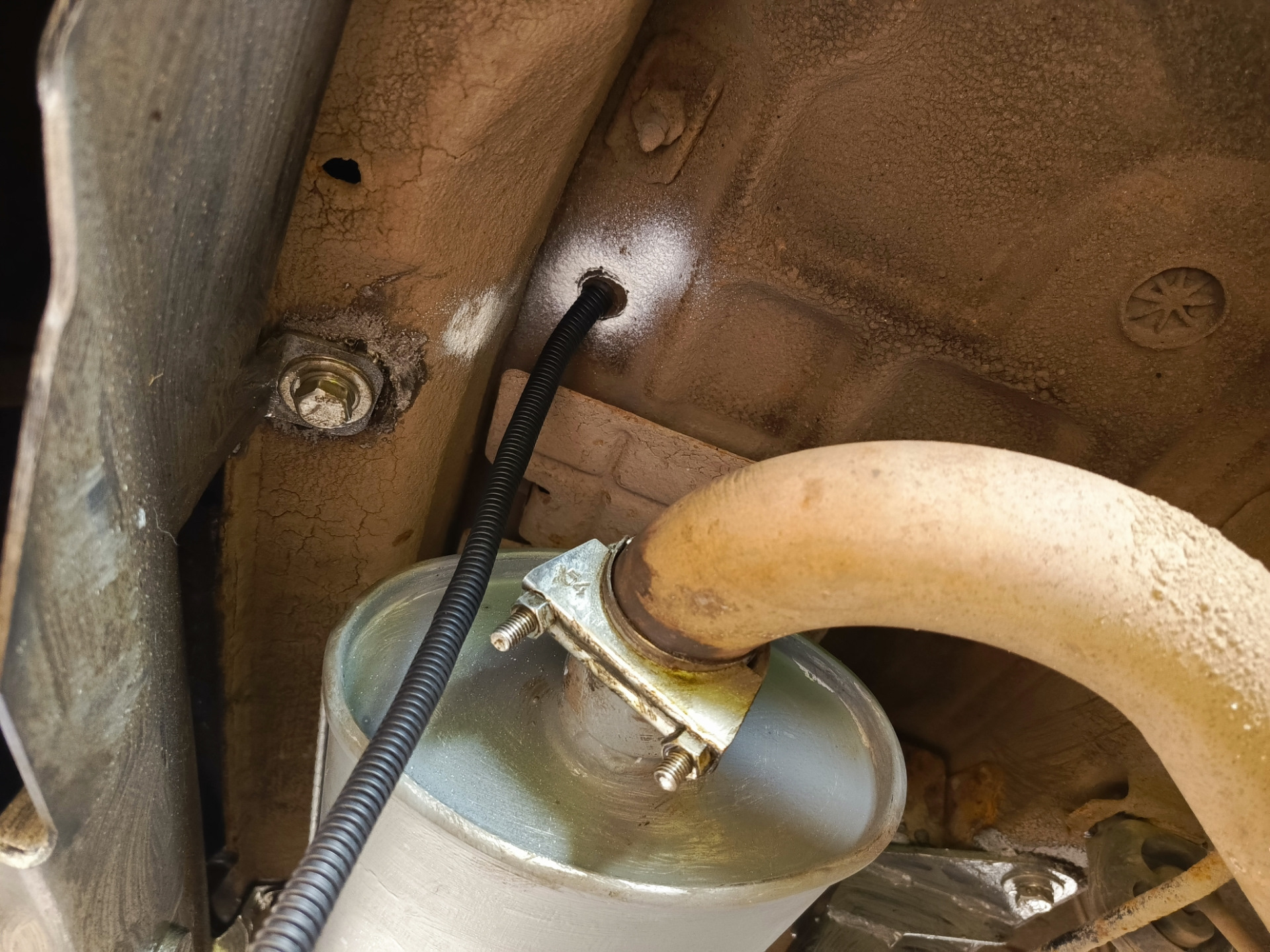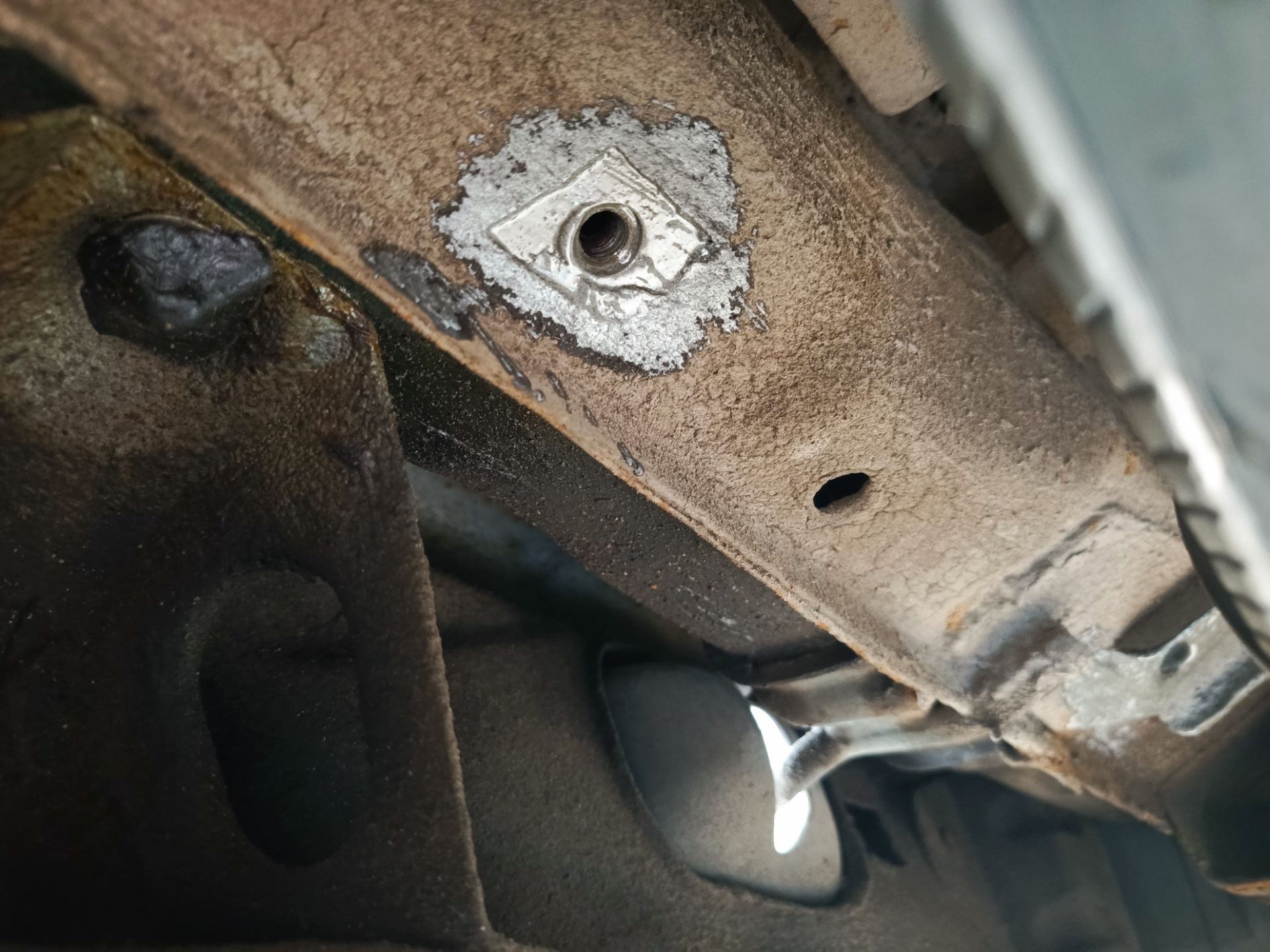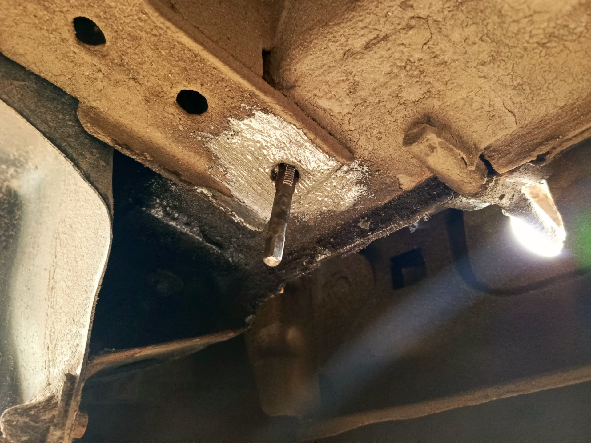 Как только получил весь набор необходимого, загрузил всё в Форд и помчал в гараж. Подготовил штатные отверстия, убрал мастику и прогнал отверстия с краю мечиком, они были забиты грязью.