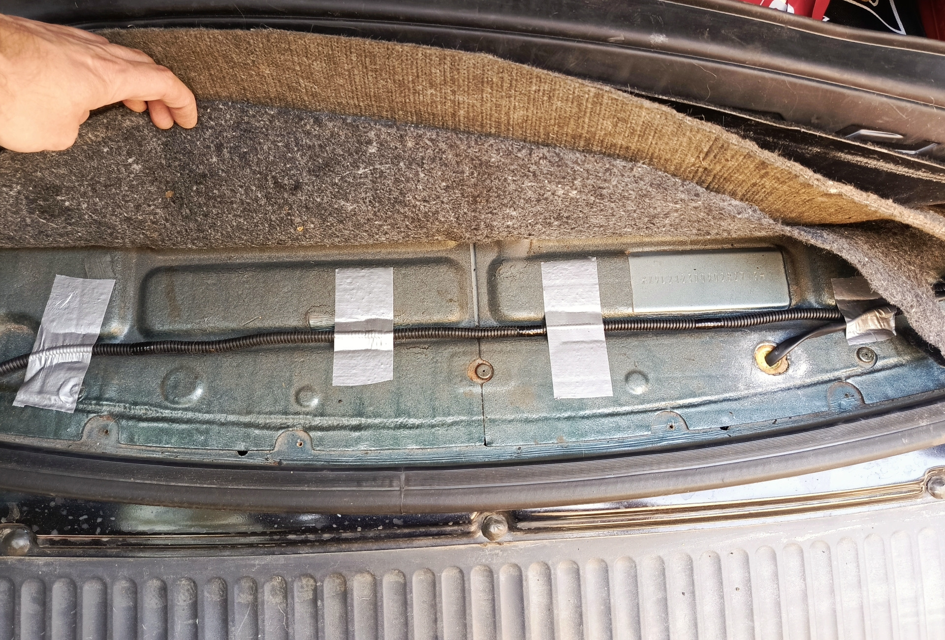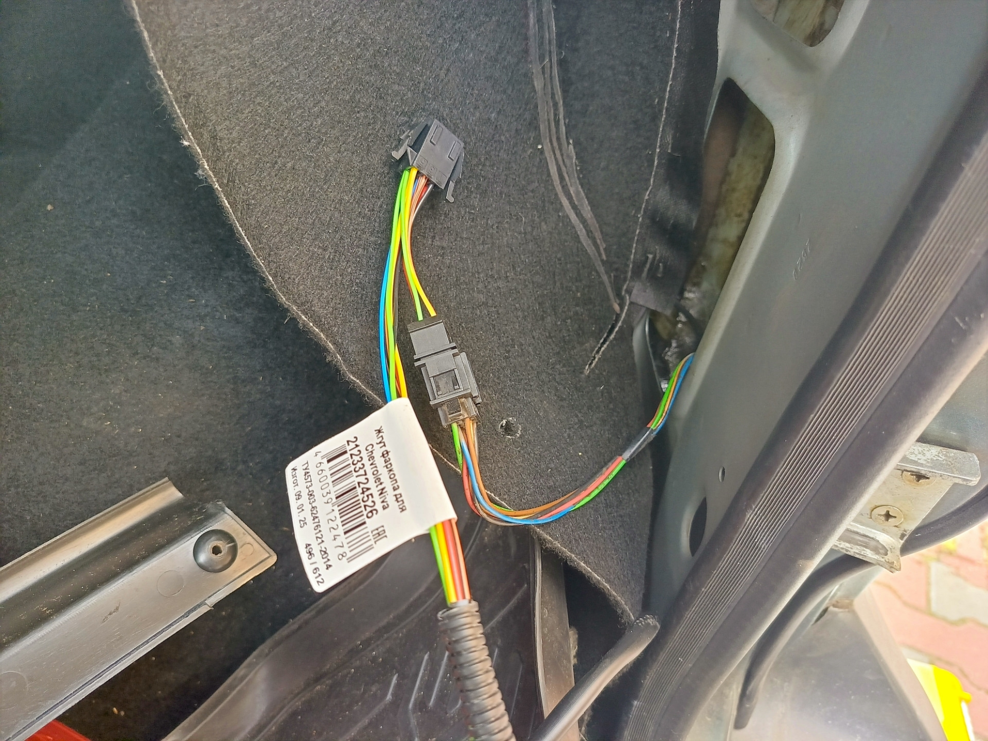 А остальное, то есть проводку я доделал уже у дома. Разъёмы соединил. Провод пропустил через заглушку. Всё что можно убрал в гофру и зафиксировал термоусадкой снаружи и изолентой внутри под ковром багажника.