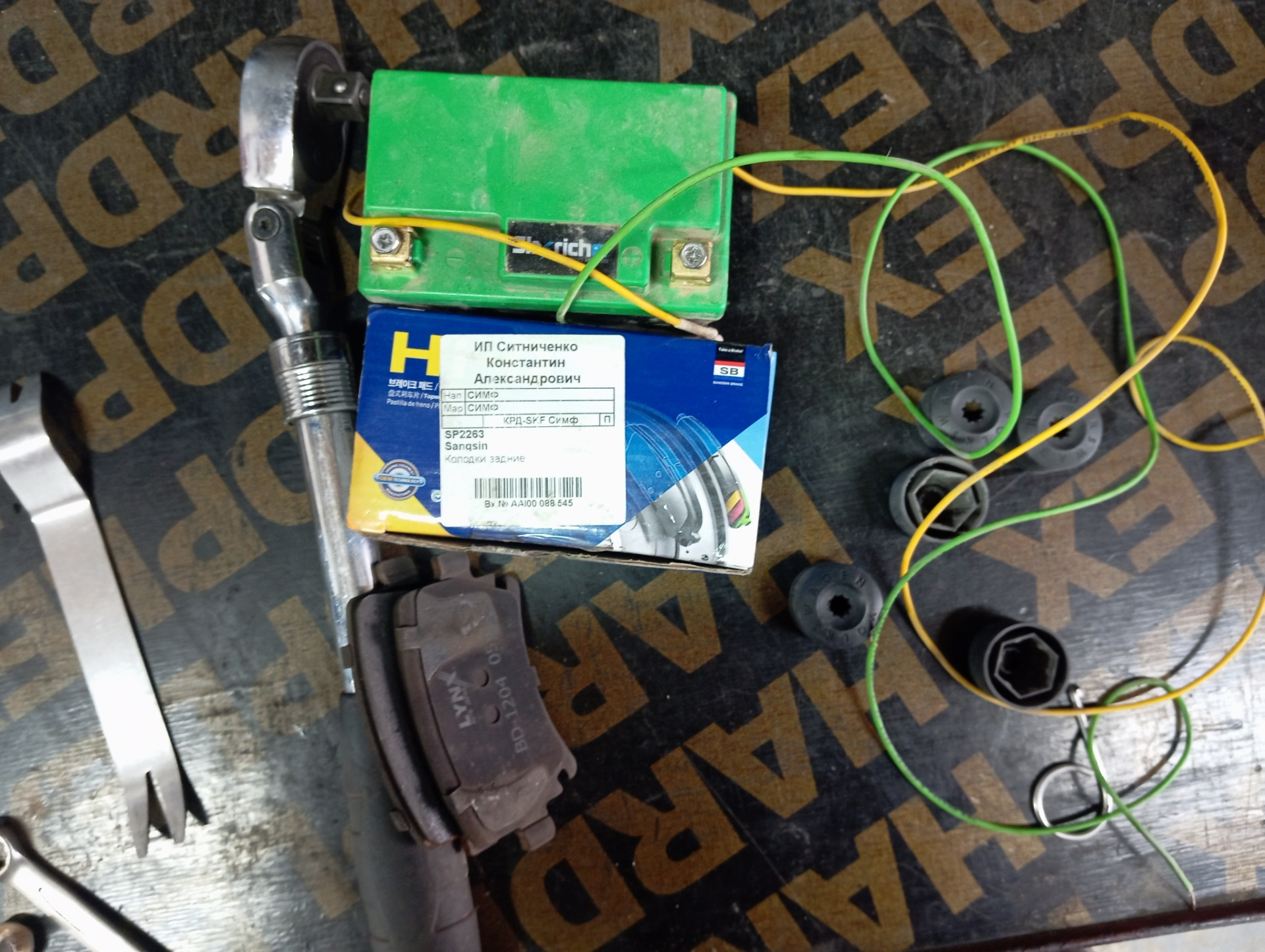 Пришло время менять колодки. Вооружился инструментом, проводами и АКБ с мотоцикла быстренько махнул на новые Sangsin Brake. Много кому ставлю тормоза этой фирмы, поэтому и себе тоже заказал.
