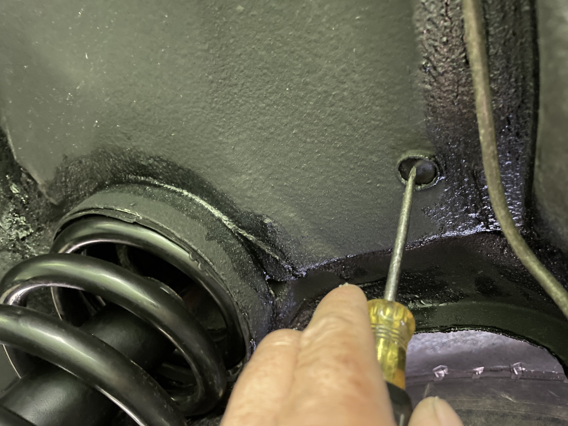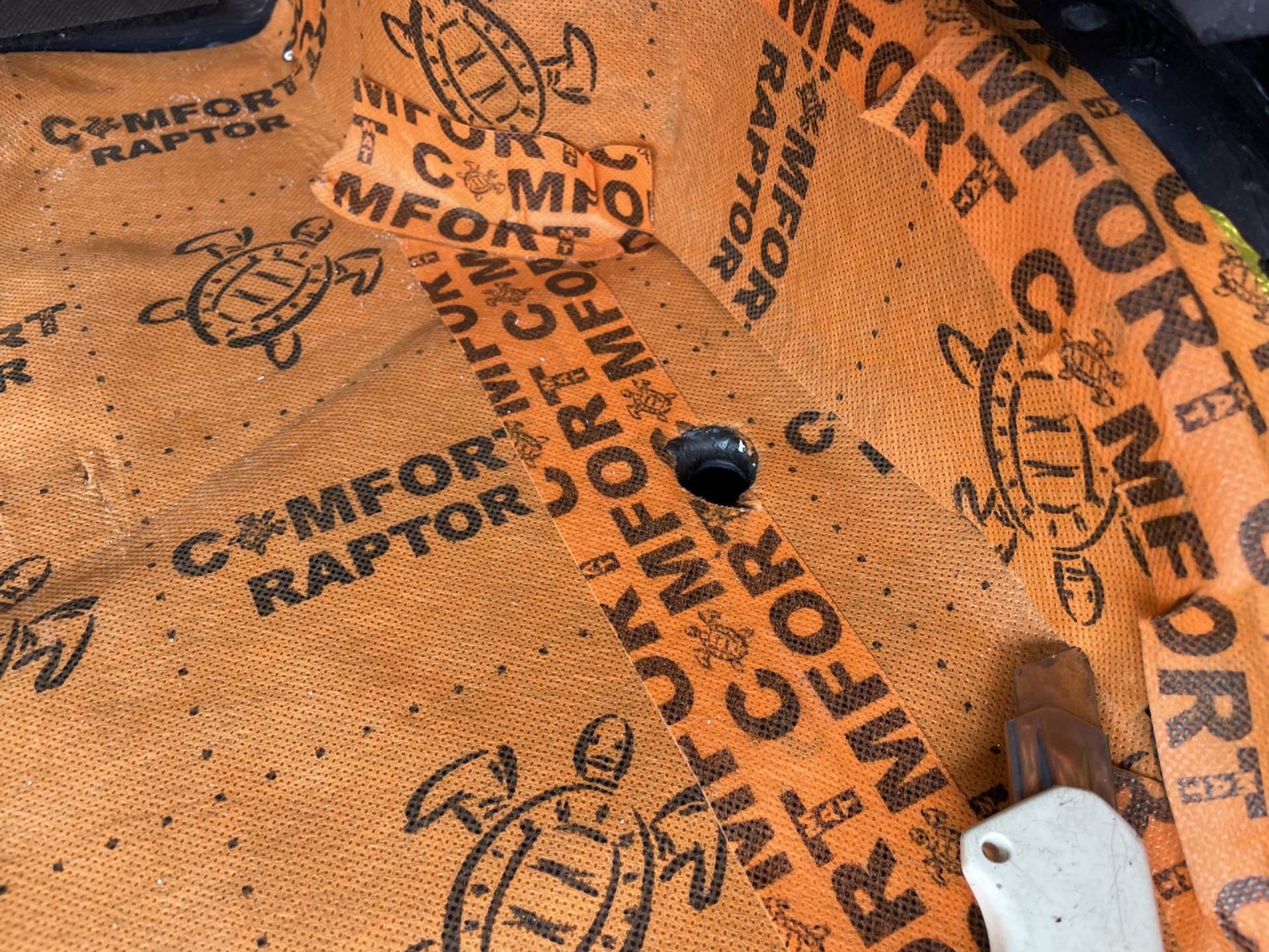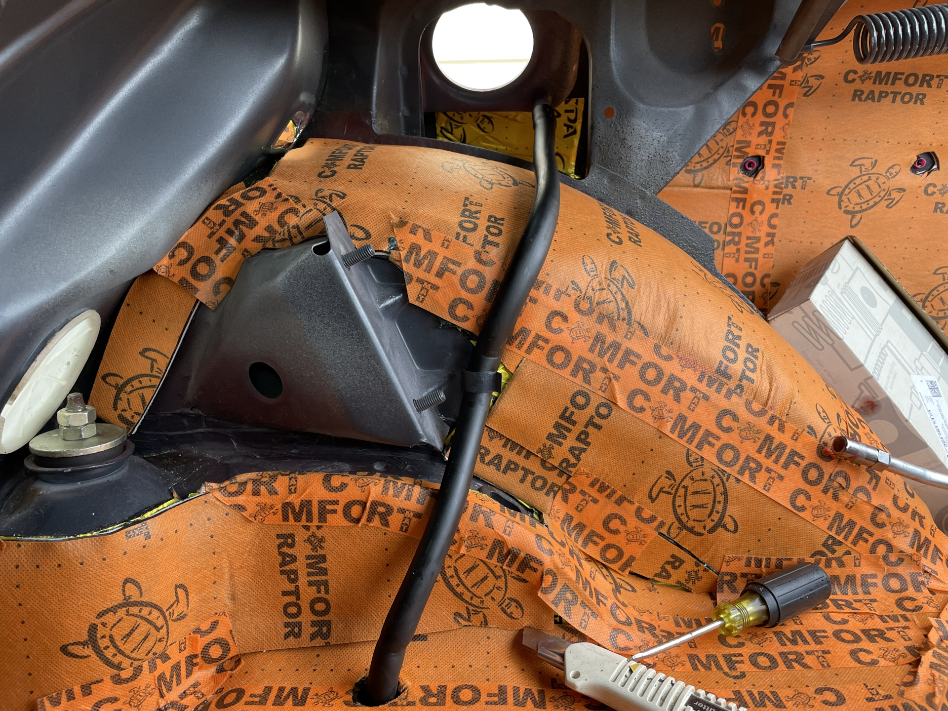 Отверстие под этот шланг оказалось заклеено шумкой, поэтому лезу под машину и обозначаю отверстие отвёрткой и уже затем вырезаю его