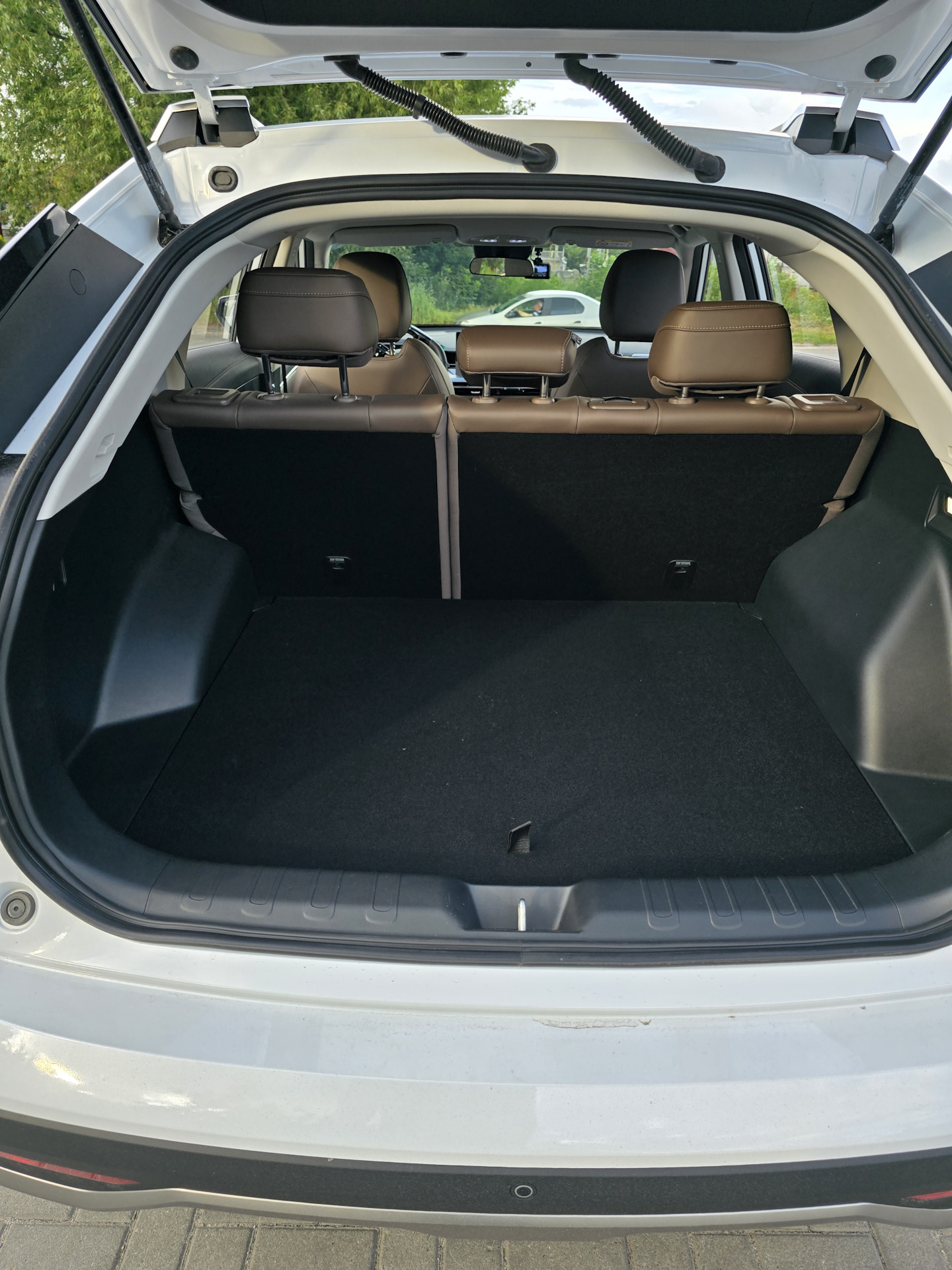 Про багажник писать особо нечего – большой и аскетичный. Литраж интересует мало, но 3 больших чемодана + несколько сумок поместились. Карманов, отсеков, ниш и т.п. нет. Есть крючок для пакетов и подсветка. Всё! Шторки нет, но тут я соглашусь с китайцами, мне она никогда не нравилась в кроссоверах. Просто один источник стуков, если лежит не плотно. Можно купить отдельно, но делать этого я, конечно, не буду. Задние сиденья складываются, получается весьма представительный отсек. Еще не проверял, но по виду можно спокойно улечься. Детям уж 100%!