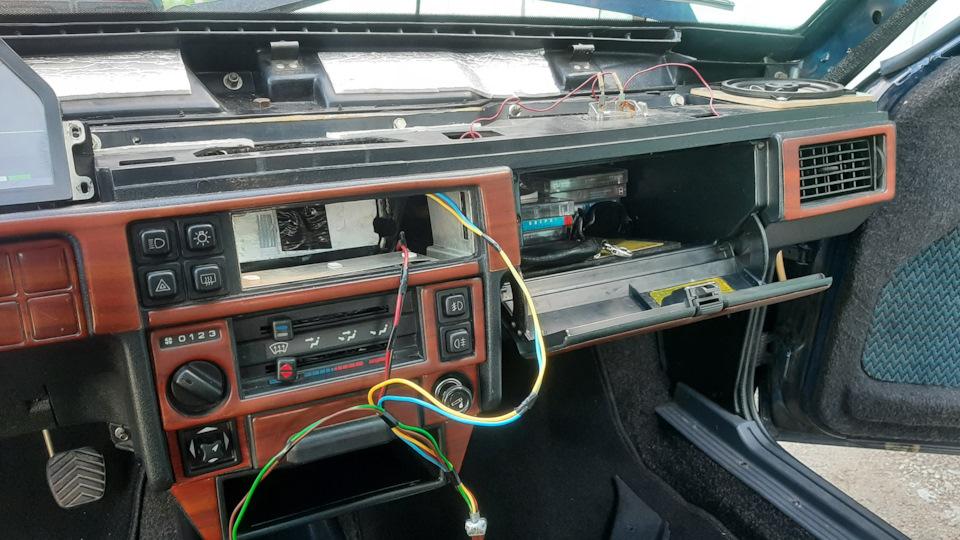 Хочу отметить, что установка не такая простая как кажется (вынул старую, воткнул новую). Оказывается места в торпеде нового образца под магнитолу мало по длине (Если просто вставить магнитолу в ее паз, то она упирается в заглушку воздуховода и торчит из торпеды где то на сантиметр). Старый Урал был тоже установлен с танцами с бубном как я увидел при разборе — заглушка воздуховода была снята, а вместо нее установлена самодельная из твердого пенопласта (на фото белая), но вставлена глубже. А магнитола Звезда как оказалось еще длиннее Урала, так еще и имеет штекер прямо точащий из магнитолы — так что я этот пенопласт выпиливал и подгонял под изгибы проводов и магнитолы где то час.