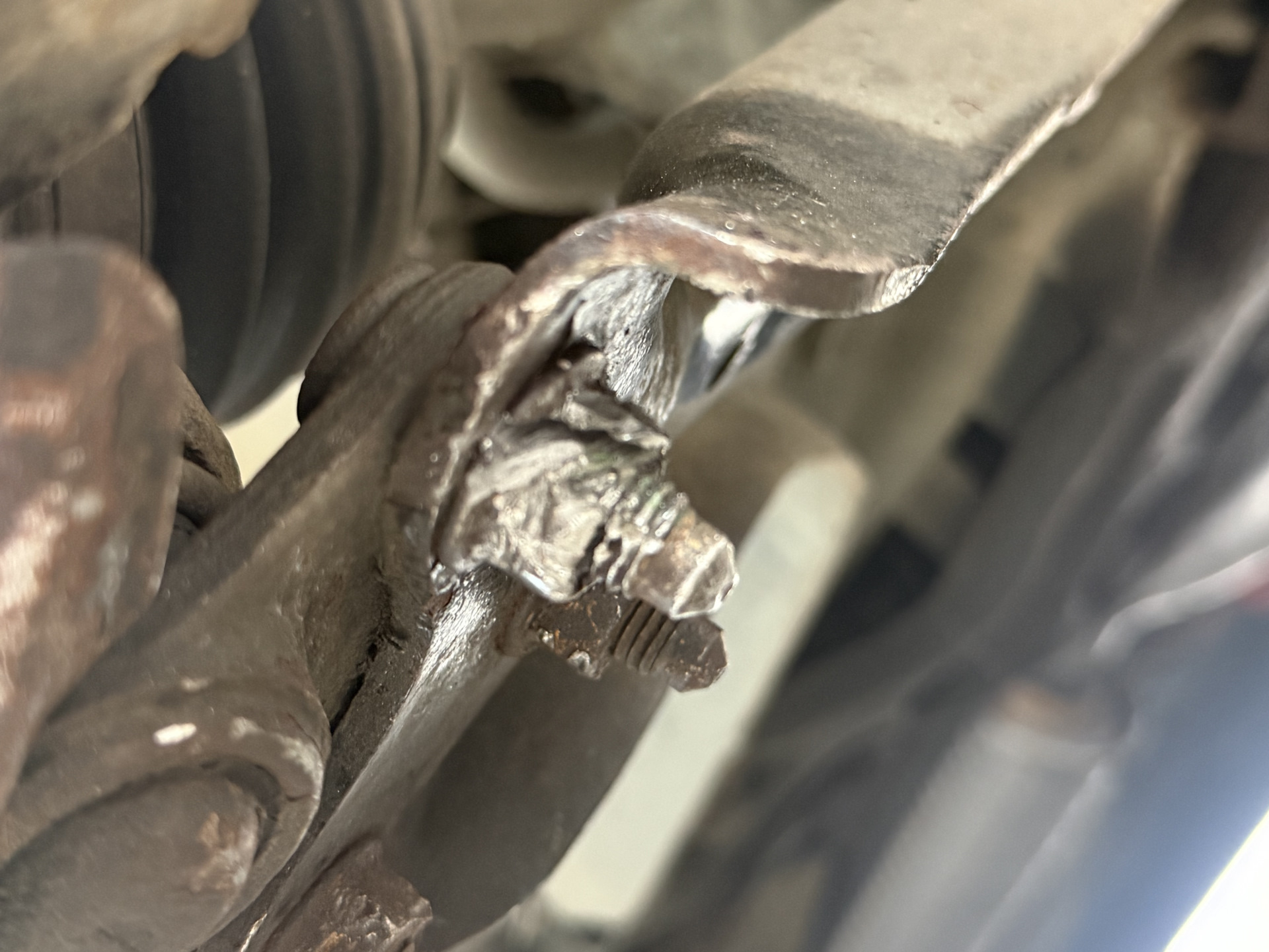 Яркий пример того, что одноразовый крепёж не зря так называется. Новый можно не мазать, в следующий раз нормально открутится.