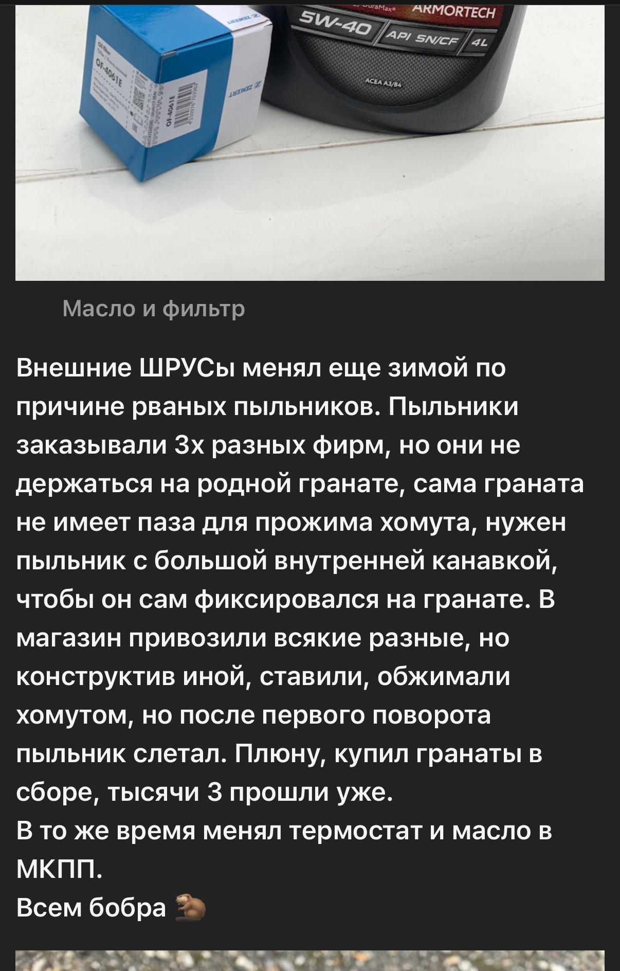 Да 3 раза пришлось. Потому что не сидят никакие пыльники на родных шрусах, соскакивают через время с внешней обоими. Заказывали 4-5 видов, не один плотно не сидит на гранате 🤷♂️. В итоге на 3 раз ШРУС целиком поменяли и все. Цена за оба вышла 3 тыс + работа.