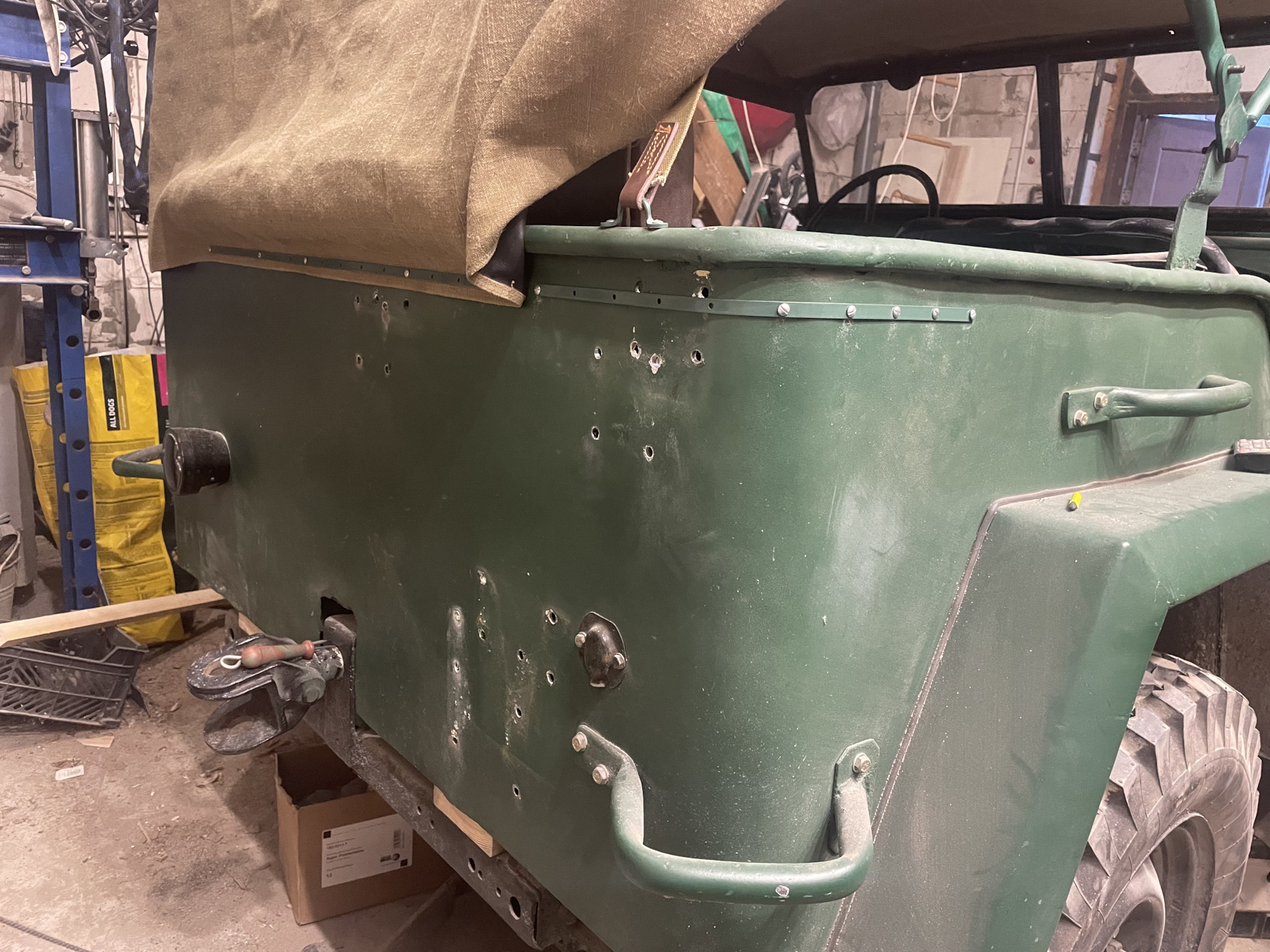 При креплении тента к кузову оказалось, что кронштейн запасного колеса не там и его пришлось переносить.