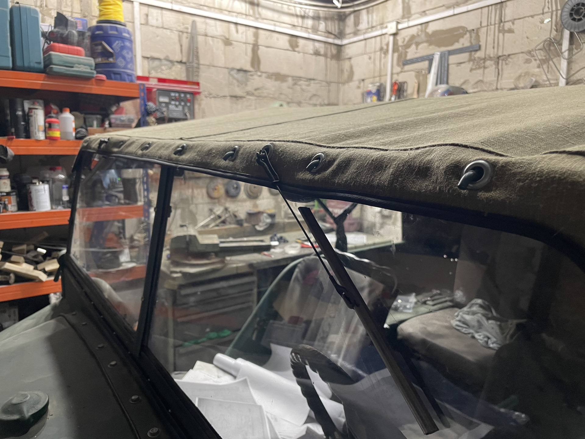 Сзади тент везде закреплен. Передняя дуга тента либо держится на полностью расслабленных ремнях, либо вообще лежит. После этого тент крепится на рамку ветрового окна и выставляется ее угол. Уже можно цеплять дворники…