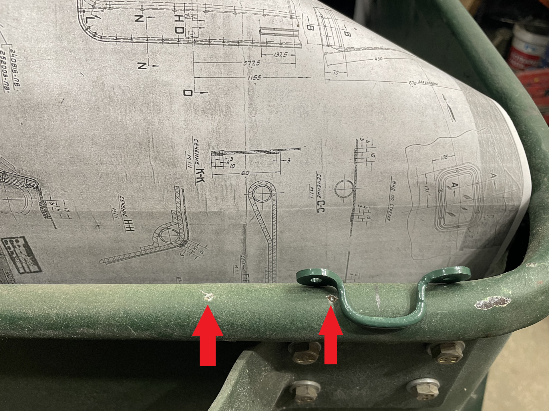Стрелками отмечены места «оригинальных» точек крепления, а скоба лежит согласно чертежу.