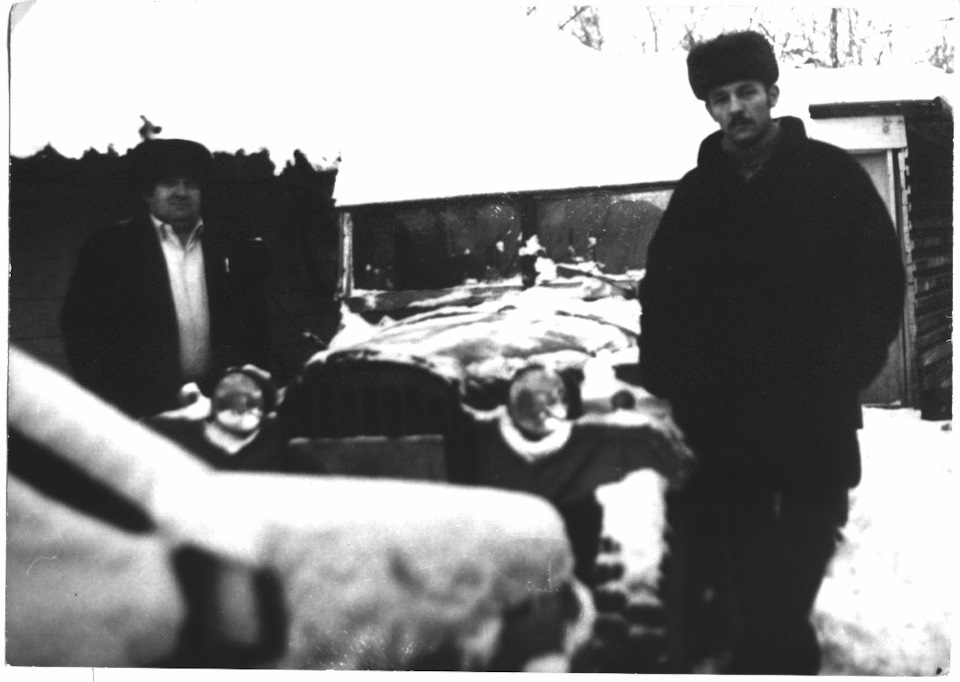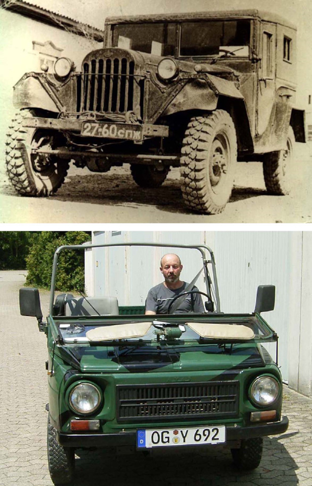 А куда мне их вешать? Тот ГАЗ-67Б наверное уже давно ушёл в небытие. После переезда родителей в декабре 1989-го в Германию я в январе 1990-го его продал. Так как у самого настроение тоже было "чемоданное", оставлять его себе не имело смысла. Покупатель был из Усть-Каменогорска, ему в принципе нужны были только документы. В те врмена ГАЗ-67Б официально можно было переоборудовать в ГАЗ-69 (так же Москвич-401 в 407-й, Победу в 21-ю Волгу и т. д.). У покупателя в гараже уже стоял собраный на 95% ГАЗ-69, не хватало только ГАЗ-67Б из которого должен был возникнуть 69-й… В январе 1991-го я был в Усть-Каменогорске и посетил его. На фото я справа, слева новый владелец Козла. На тот момент 67-й хоть и обитал под открытым небом, но ещё был живым. Если внимательно присмотреться, то можно заметить оптику фар от ВАЗ-21011, это была моя работа. При покупке на машине стояли фары от трактора (см фото выше), отца это особо не заботило. Пустые корпуса родных фар были в придачу с машиной, в итоге я в начале восьмидесятых купил оптику ВАЗ-21011 и установил её в родные корпуса.