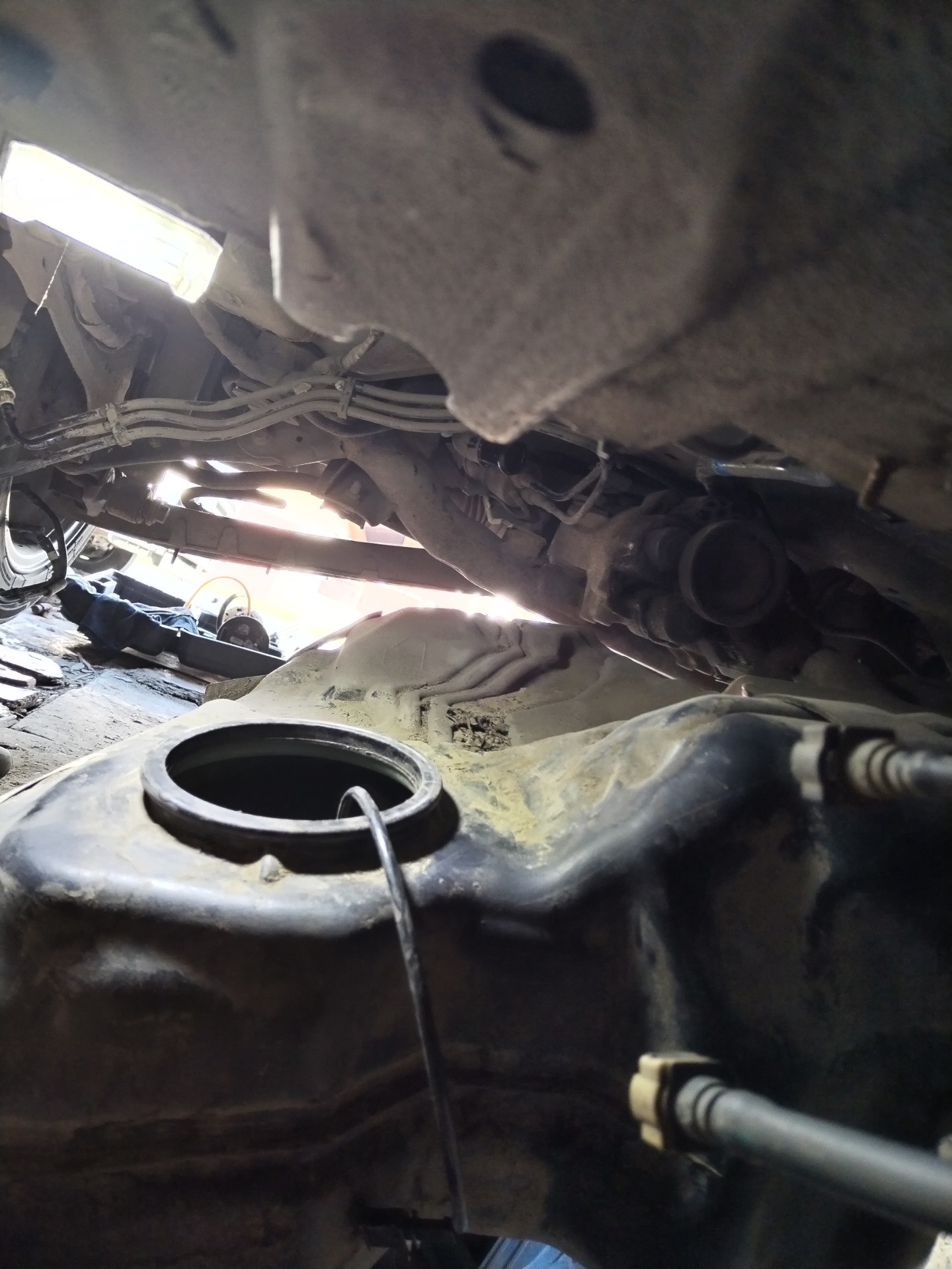 В итоге пришлось лезть в бак прямо под авто. Кстати у меня на баке не оказалось гайки, а модуль держится разъёмной шайбы (так что ли обозвать, что-то не сфоткал) и затягивается металлическим хомутом. Через шланг слил остатки бензина — около 16-ти литров.