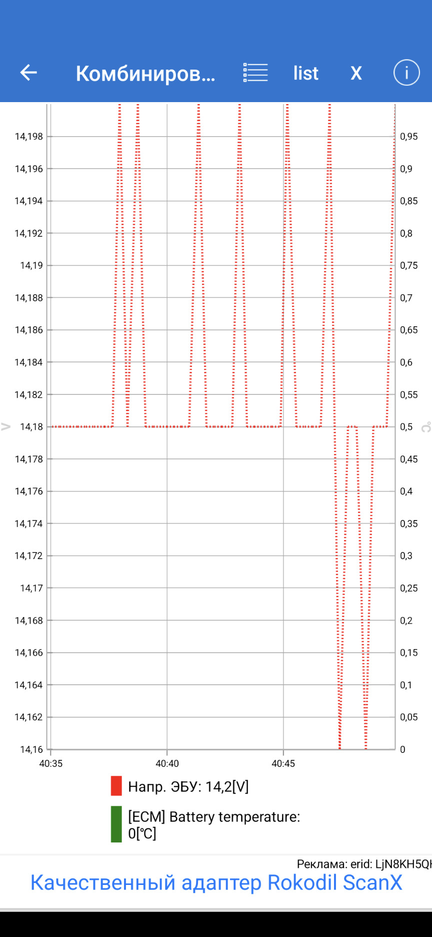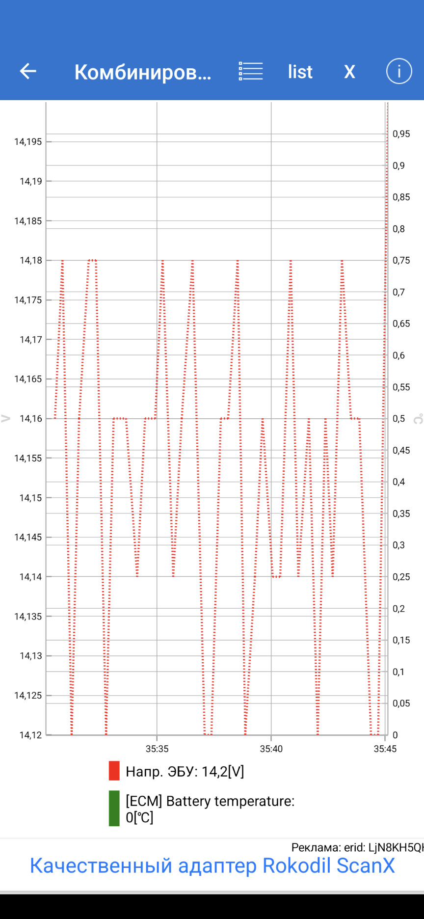 Carscanner на запущенном. Вот напряжение 12.7 как раз из-за этой умной зарядки. А 14.1-14.2 это обычная работа регулятора, как я понимаю.