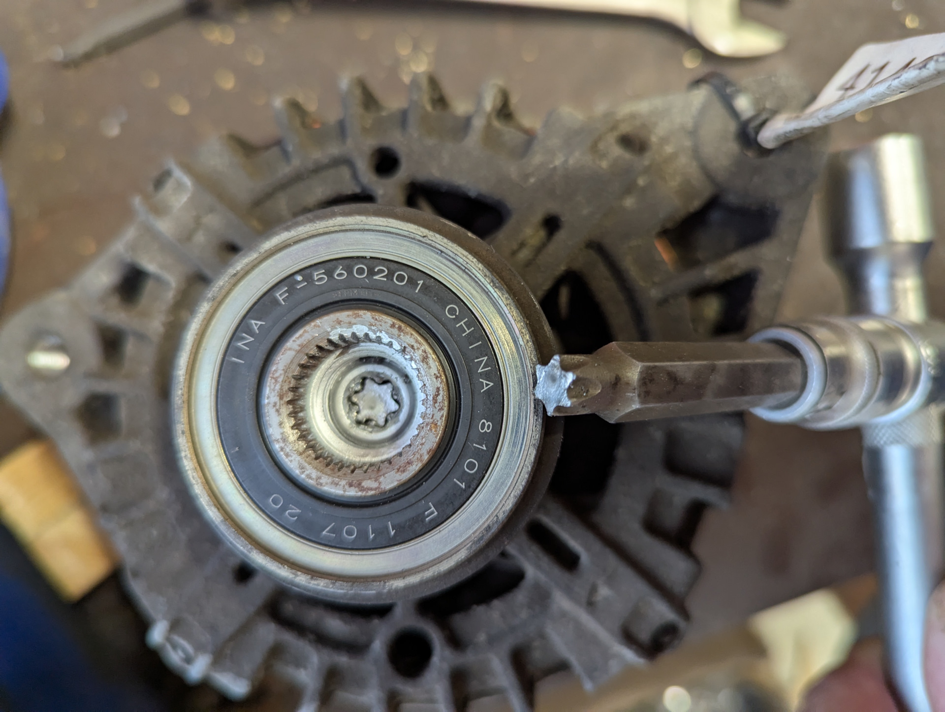 К слову, старый заклинивший шкив получилось открутить от вала с помощью старого поликлинового ремня, обернув им несколько раз шкив и прибив ремень к доске. А ключ использовал уже с коротким рычагом, что возможно, когда раскручиваешь без спецключа, через который насквозь должна выходить головка torx.