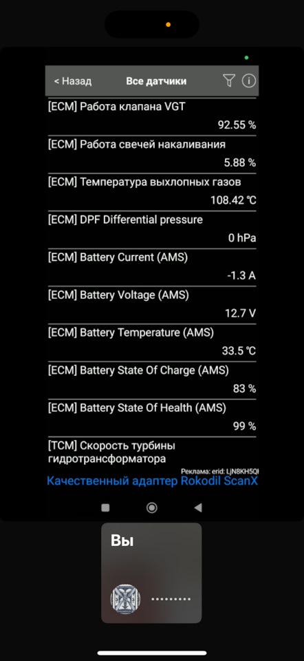 Нужно обязательно поставить дисплейчик с параметрами по OBD2 на приборку. Я такой купил несколько месяцев назад, когда была необходимость мониторить температуру ОЖ. Но он пришел с разбитым дисплеем с али… Нужно перезаказать еще раз.