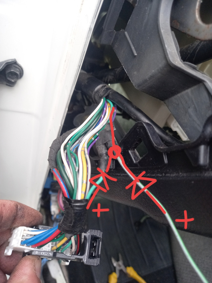 В разрыв этого светло-зелёного нужно диоды впаять. Один как бы прямой получится, а через второй нужно будет подать плюс от зажигания.