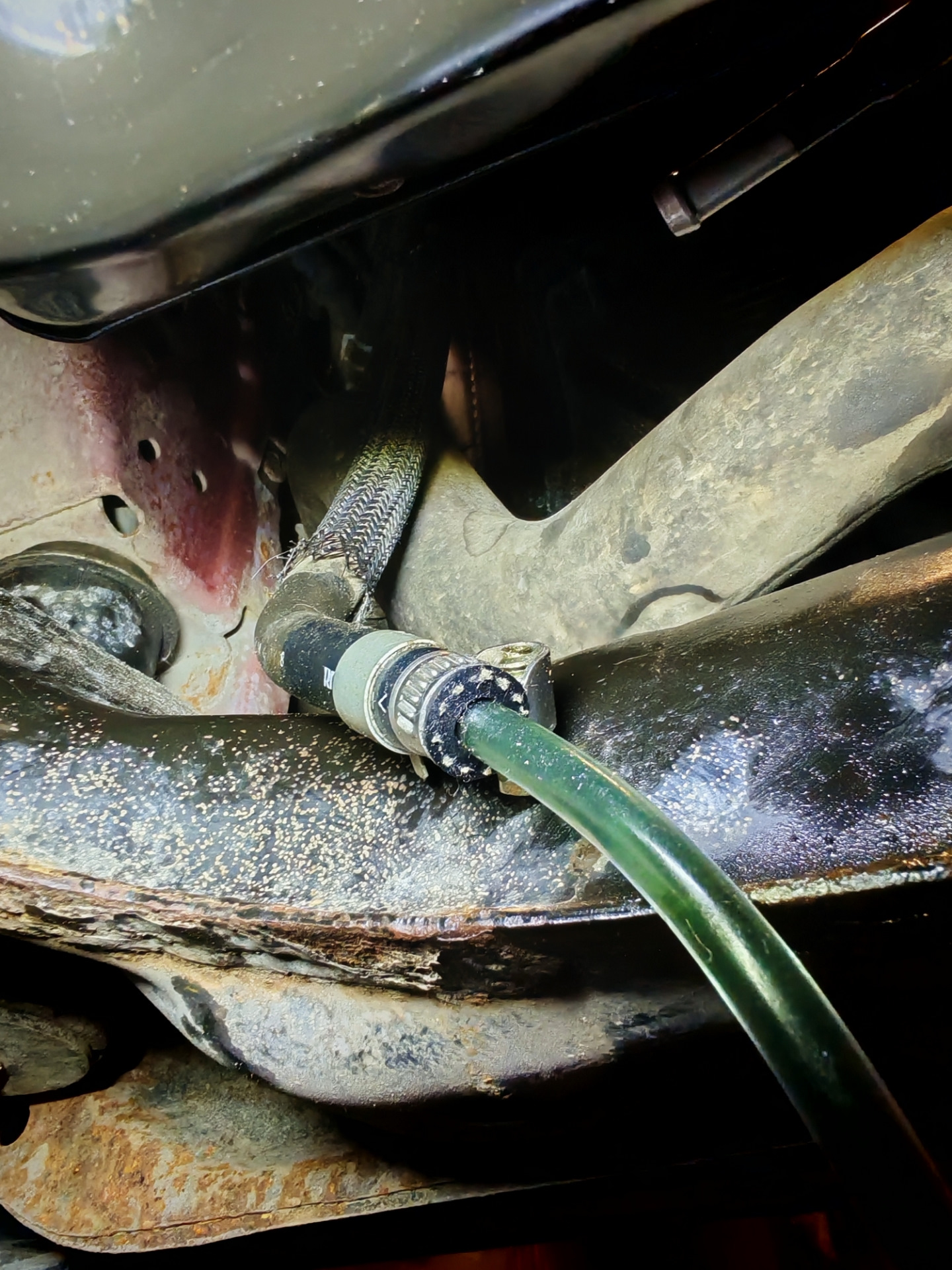 Делаем полную замену, поэтому снимаем нижний шланг, идущий от радиатора к низу коробки, в место, где расположен фильтр тонкой очистки. Там такая изогнутая трубка, не ошибётесь. Кто-то компрессором продувает, а я вытеснением, поэтому наш шланг — нижний