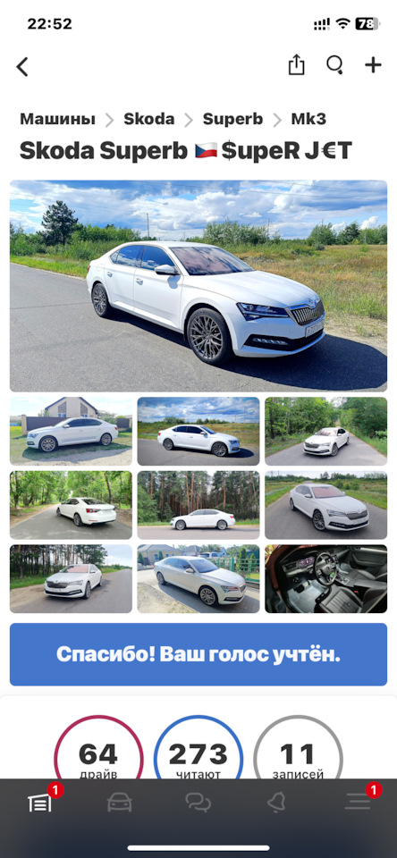 Уже третья моя машина участвует в выборе машины дня, октавия кстати тоже участвовала прошлым летом и мы заняли 7 место, но всё равно было приятно оказаться в 10-ке 👍