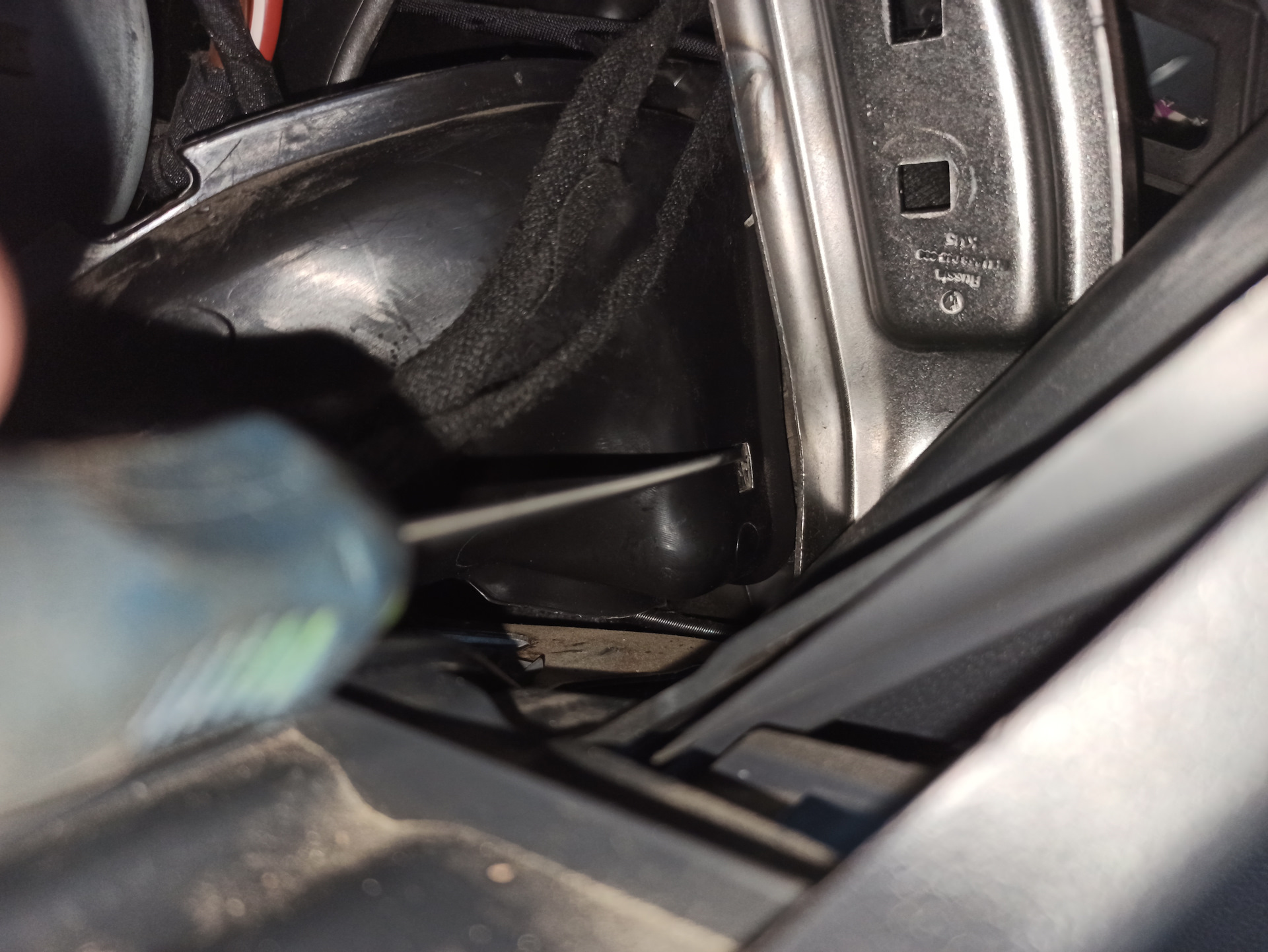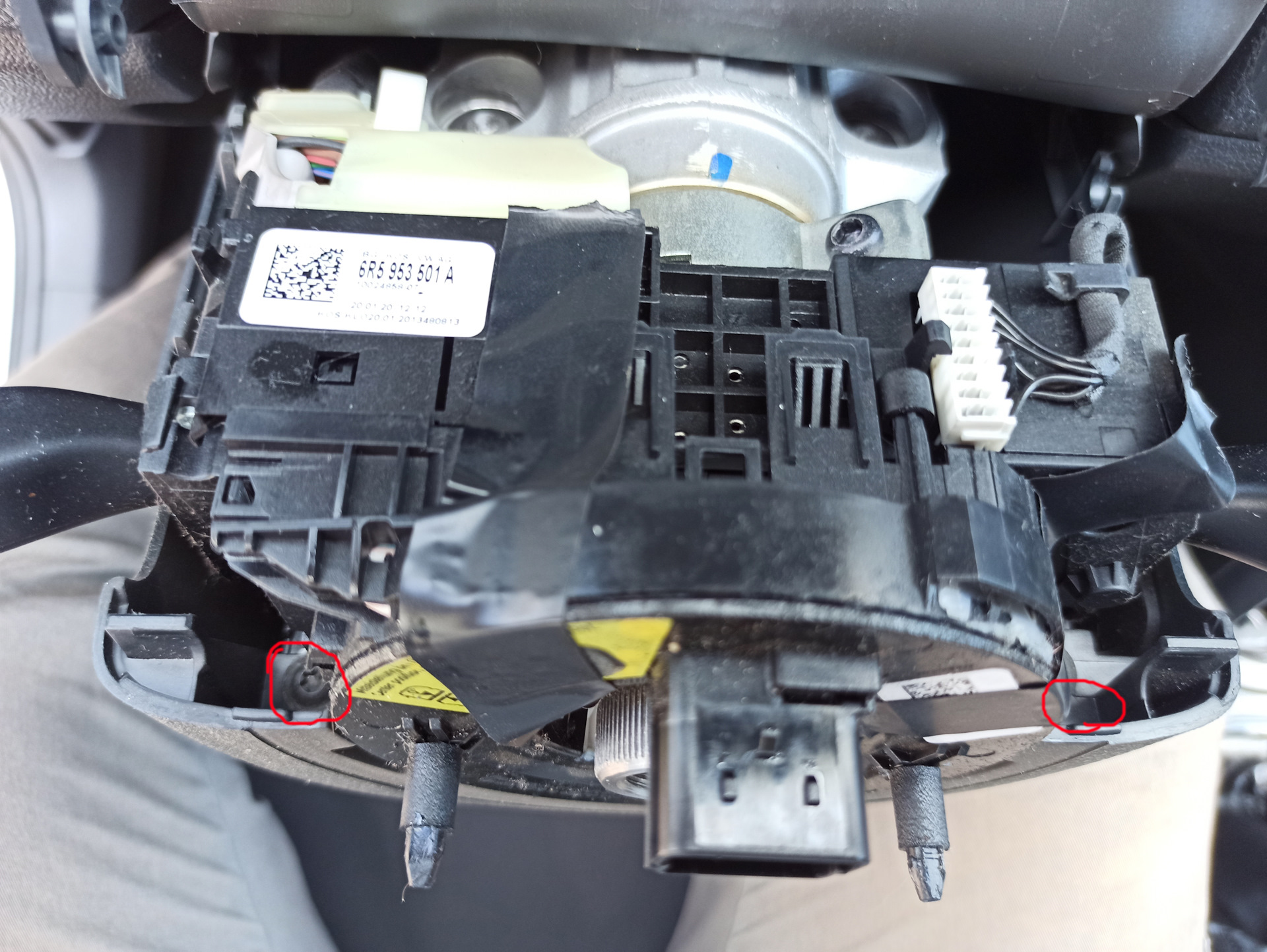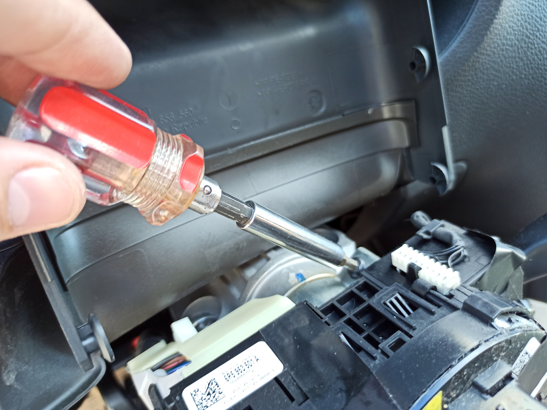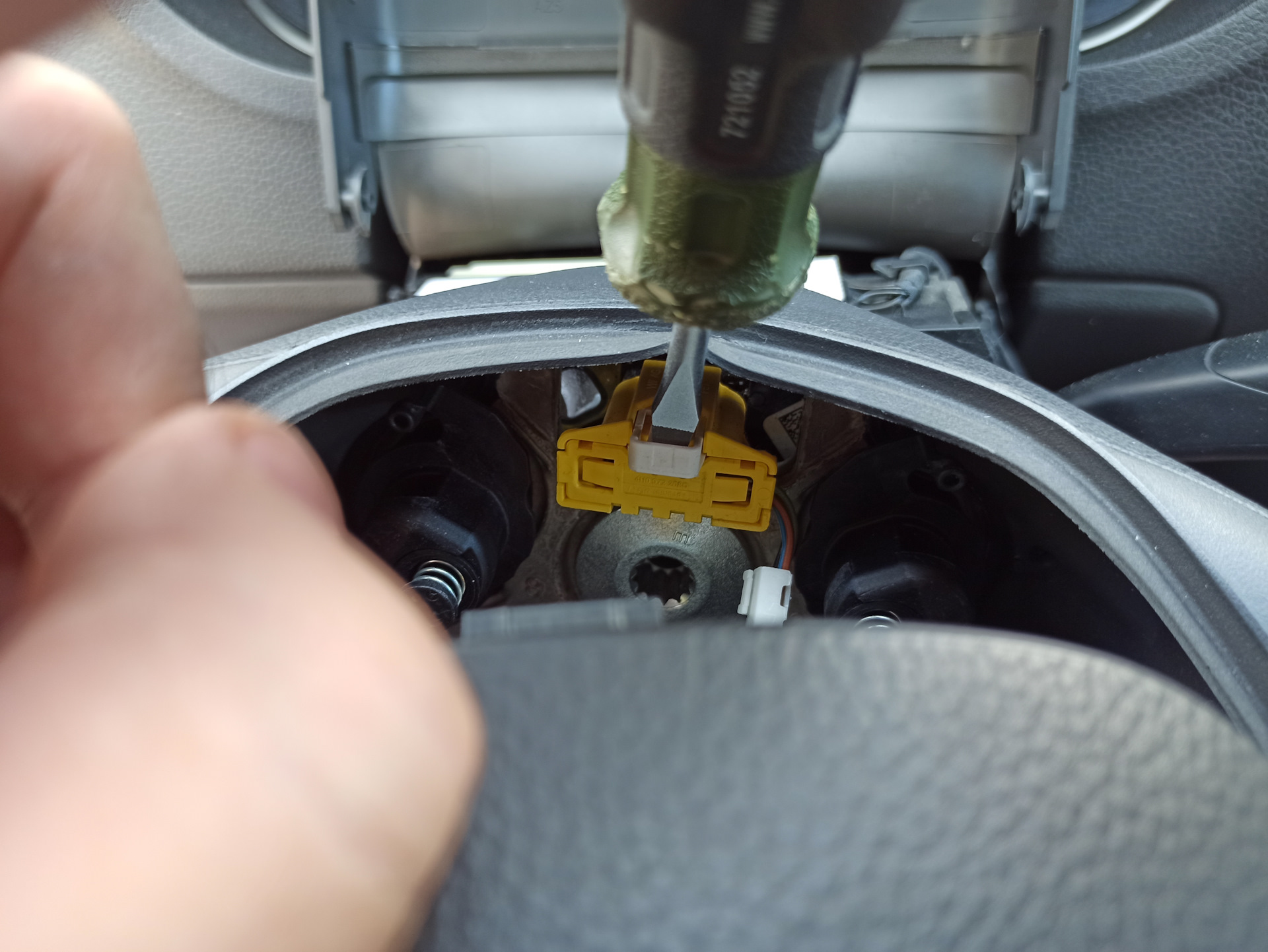 После снятия руля снимаете пластиковый подрулевой кожух. Он крепится на винт торкс Т20 снизу и два самореза торкс Т20 справа и слева от улитки.