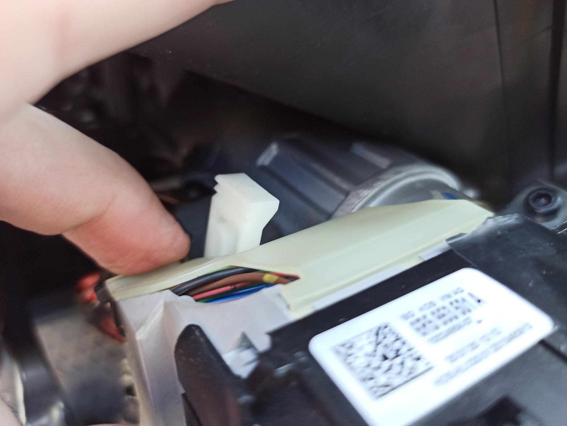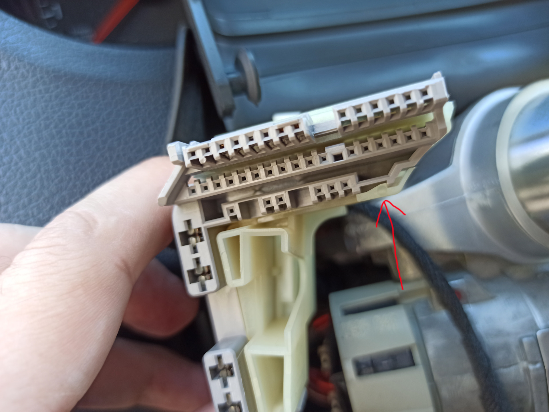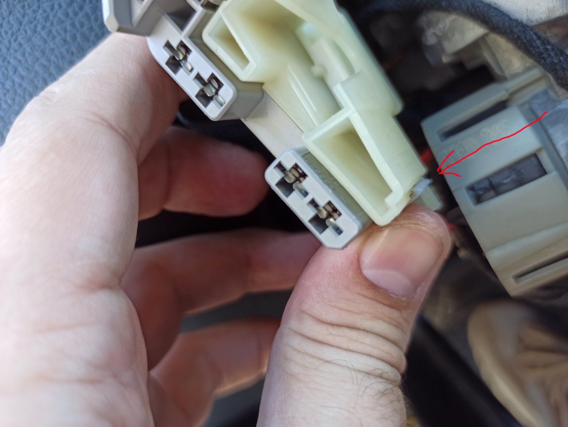 Вытягиваем белый фиксатор вверх, и разъем сам отщелкнется от подрулевого блока.