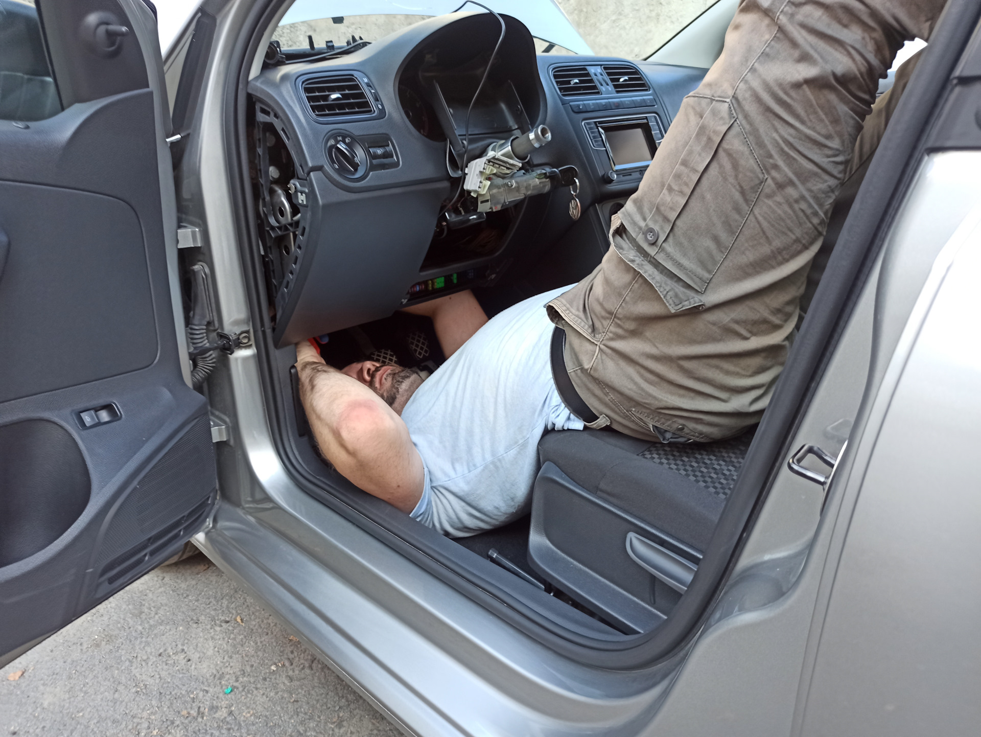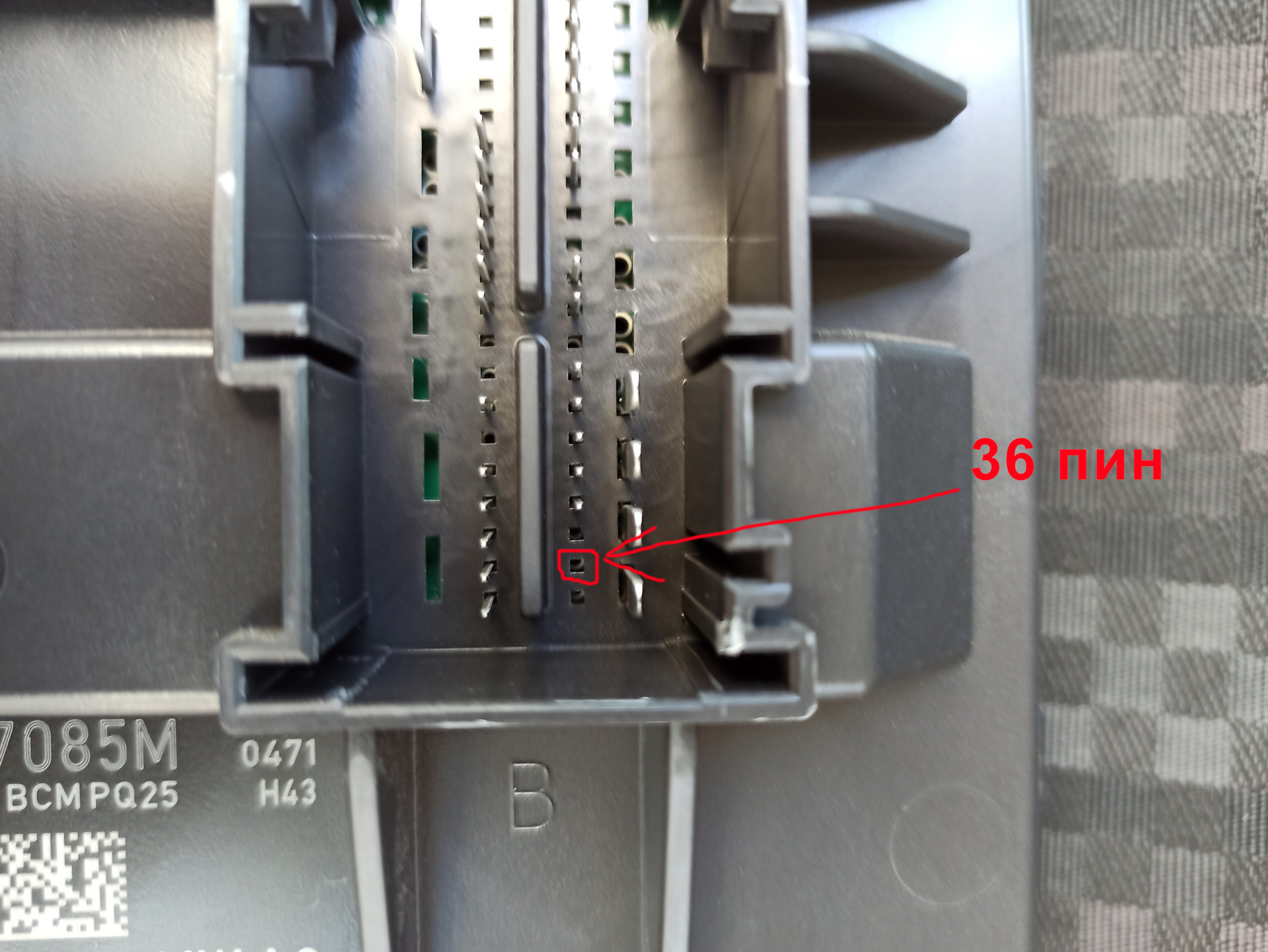 Снимать сиденье не захотел, поэтому я подлез туда вот так… Как говорится, делайте так каждый день, и спина болеть не будет 😂. С блоком BCM ждало меня разочарование. Стоит у меня самый дешманский, и вместо 36-го пина зияло пустое отверстие. Поняв, что круиза мне с этим блоком точно не видать, завел провод (по схеме для 12-ти кнопочного мультируля) на 17-й пин.
