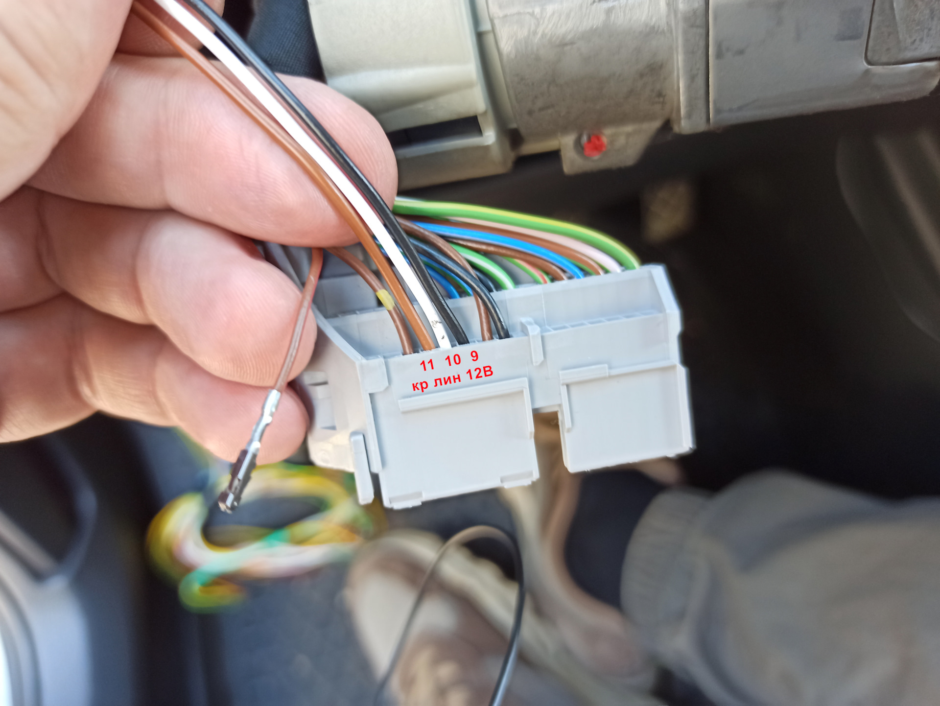 Из 11-го пина убираем и изолируем провод гудка. Устанавливается три новых провода: в 11-й — круиз на 23-й пин ЭБУ (коричневый), в 10-й — лин-шина на BCM (белый) и в 9-й — питание на блок предохранителей (черный). Пины там используются N90764701.