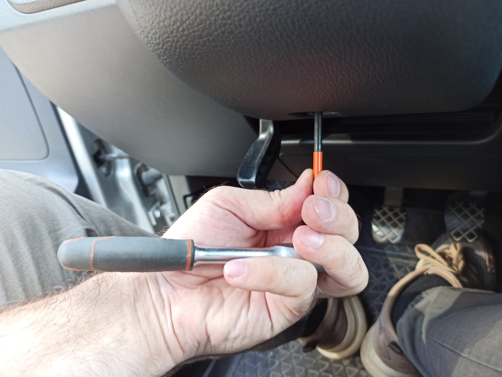 Дальше перебираемся к блоку предохранителей. Для снятия блока откручиваем пару винтов торкс Т20 у самого блока и снимаем патрубок обдува ног водителя.