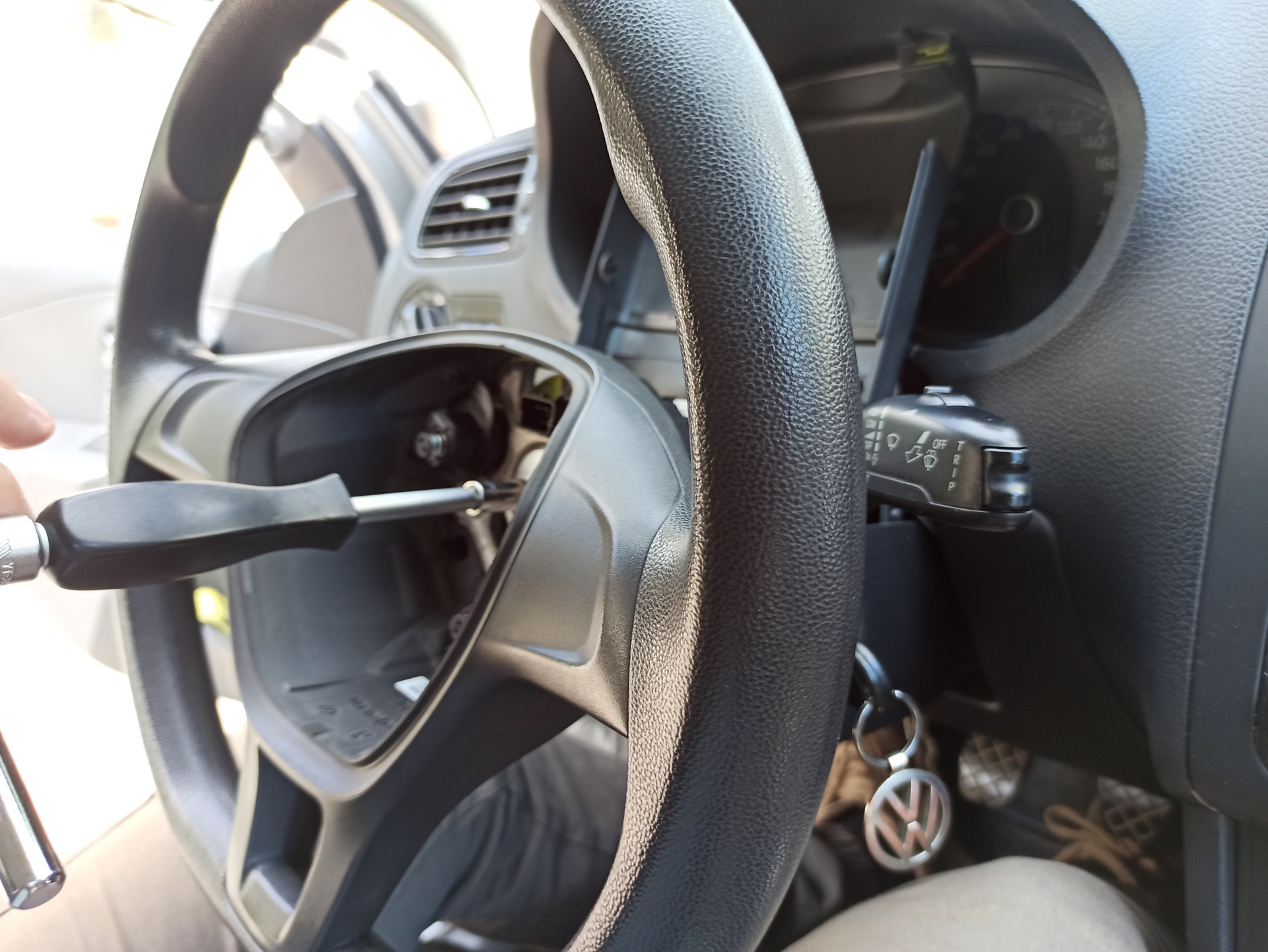Для снятия рулевого колеса битой SP LINE M12 откручиваете гайку. Ключ оставляем в замке, чтобы ничего в процессе откручивания не свернуть. Гайка руля затянута очень хорошо. Подпирал руль коленями снизу и откручивал воротком гайку.