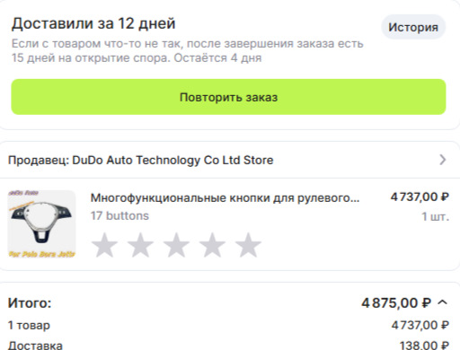 Общие затраты на мультируль вышли 9 976 руб., из которых: руль под установку накладки с кнопками с авито — 3 584 руб.; кожа для перетяжки от «Пермь-Рулит» — 1 250 руб.; разъем кнопок мультируля 8R0973605 заказывал в «Росско» с промокодом «D2» обошелся 267 руб., накладка с кнопками 6C0959442F с АлиЭкспресс — 4 875 руб. В сравнении с ценами на «Авито», где за такой же руль продавцы хотят 28–35 тыс., мой обошелся в три раза дешевле, поэтому свое предприятие считаю мега выгодным.