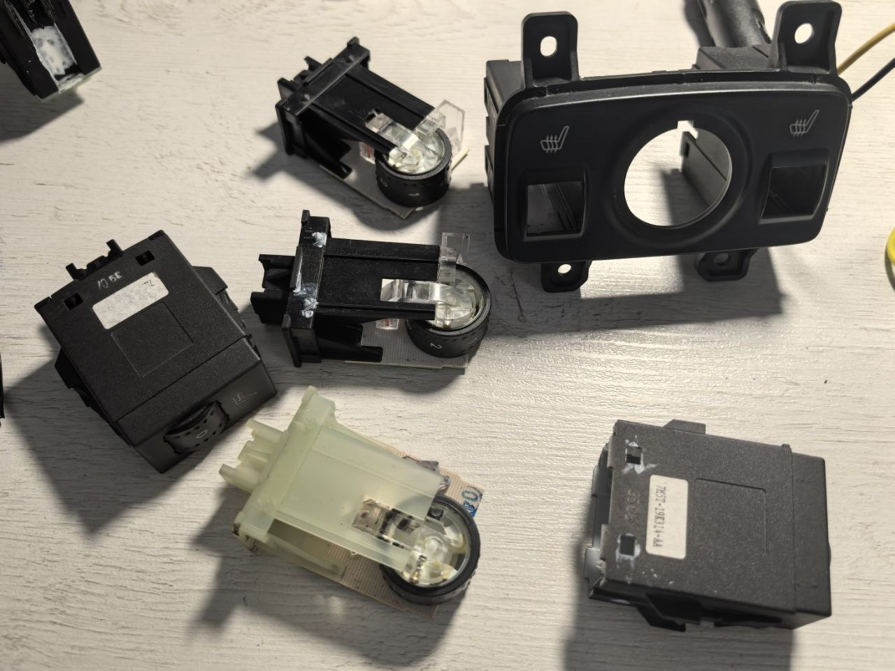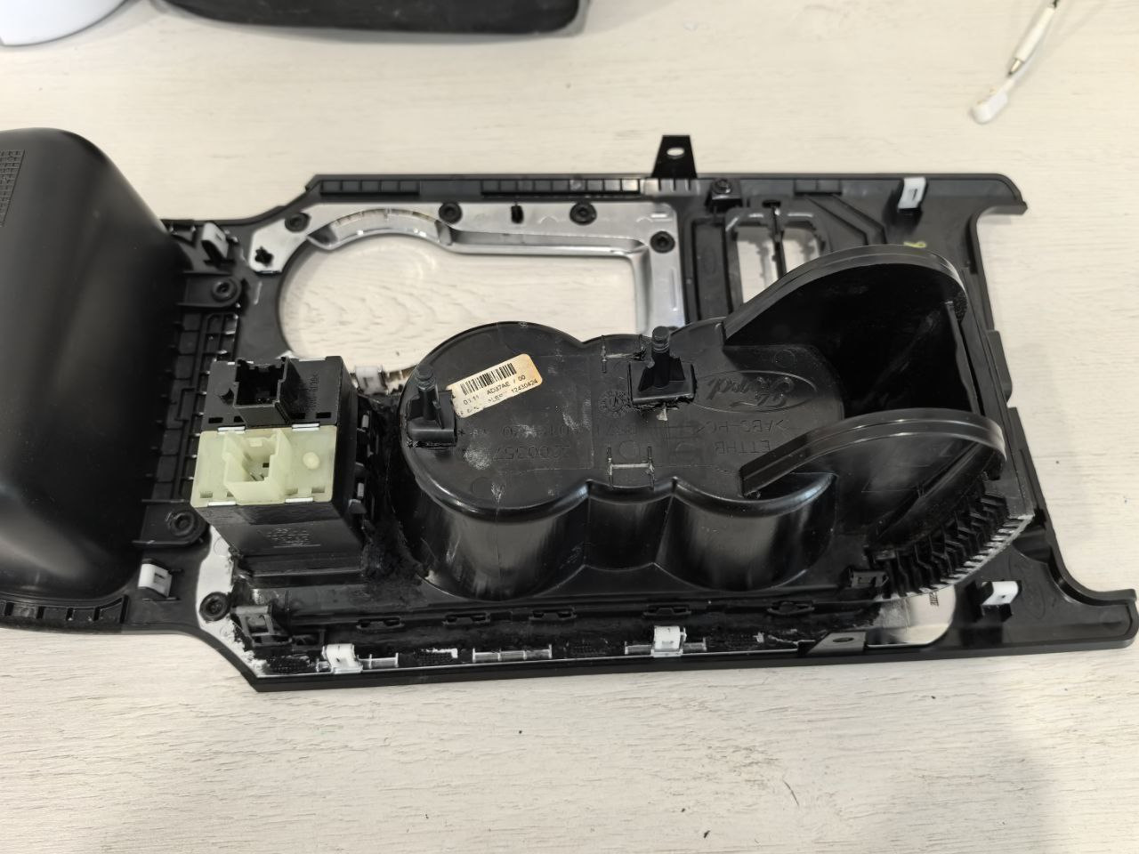 Да как так то?! (И это первая полностью пустая трата). Потом я купил естественно от Фокус-3 с бирюзовой подсветкой. Но место установки, в тот момент, которое меня устроило бы, так и не было найдено. И вот пока я лопатил интернет в поисках идей по установке подогрева сидений, совершенно случайно мне на глаза попадается фотография салона от Мондео-4. А кнопки у них где подстаканники, и да ещё закрыты шторкой. Ну раз уж делаем не по штату, то чтобы хотя бы выглядело не колхозно! Идея понравилась, но встал вопрос с размерами, а подойдет ли? Благо вспомнил, что у 72chip Мондео4, да еще и консоль со шторкой. Попросил его снять размеры, и потом с линейкой к себе в машину. Всё отлично, длина совпала, а ширина у меня чуть больше и это лучше, чем наоборот. Ну а дальше по отработанной схеме: поиск, покупка и ожидание доставки. А купил я целиком консоль от Мондео-4, правда чтобы уменьшить сумму доставки, я попросил продавца её разобрать и отправить только нужные мне комплектующие. И вот теперь этот подстаканник надо внедрить вместо моего подстаканника. Дальше дело техники, как говориться. Теперь встает вопрос "Как внедрить туда мои крутилки?" А никак! 😂 Дальше ищем кнопки, т.е. крутилки от Фокус-2/С-max. Они выполнены каждая в самостоятельном корпусе и это то что нужно. Вот тут мне и пригодились крутилки от Фокус-3, переставил в корпуса от Фокус-2 и готово.