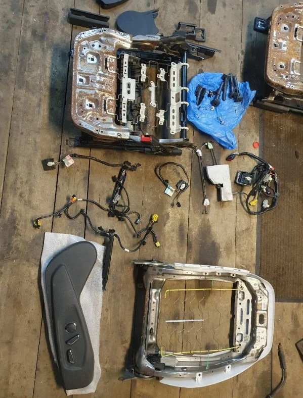 Начались поиски комплектующих. Отдельно обогрев тоже не нашел, был вариант купить сидушки, но они в другом городе, доставка дороже самих сидушек, а продавцы не хотят разбирать и вытаскивать обогрев. И вот удача у себя в городе на разборке нахожу комплект передних сидений от Фокус-3 дорест с обогревом за 3т.руб! Не теряя времени после работы вечером лечу ну другой конец города за сидушками. Сразу скажу состояние сидений было ужасное (ну и цена соответствующая), но мне от них нужно только одно 😁. Забираю, везу к брату в гараж и сразу же, дербаню сидушки, снимаю и проверяю сопротивление обогрева (оно есть, а какое правильное я не знаю, но главное что не в обрыве и у обоих комплектов оно одинаковое, что на сидушке, что на спинке), всё остальное в мусорку и на металлолом.