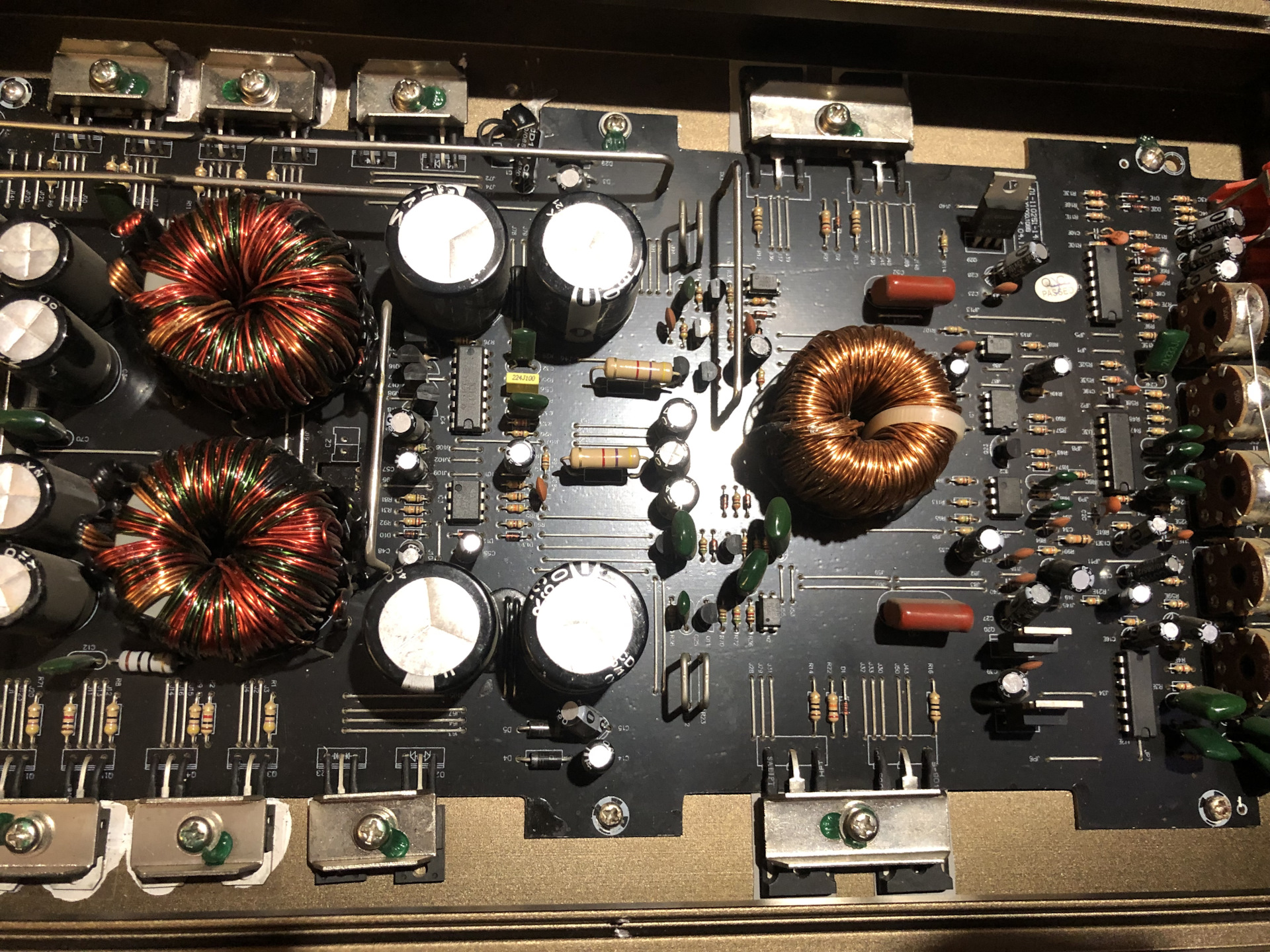 Не было звука на выходе, индикатор горел синим, без защиты. Генерация на БП есть, генерация на выходе есть, что очевидно сразу ставит под сомнение предварительный усилитель. Отсеив два операционных усилителя проследив прохождение сигнала с RCA — уперся в окончательный третий, который между двух, с него съем звука в конечном итоге был. Заменил — звук появился.