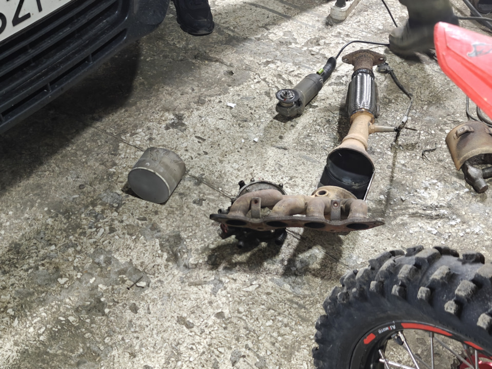 Пользуясь случаем проверили компрессию, везде до 12, свечи оригинал, там всё ок. И как потом вспомнил, что подозреваю наличие катализатора (большая редкость на таких авто в нашем регионе) мастер послушал выхлоп и сказал да, у тебя катализатор на месте. Запустили эндоскоп, и правда, стоит, красуется)) по бокам у стенок расплавлен, порекомендовали удалить, ну а че я, давай удалять. Сняли, проверили на "светопропуакаемость", а там мрак)) (потом выяснится, что не так уж и плохо там все было, просто свет был шляпный)
